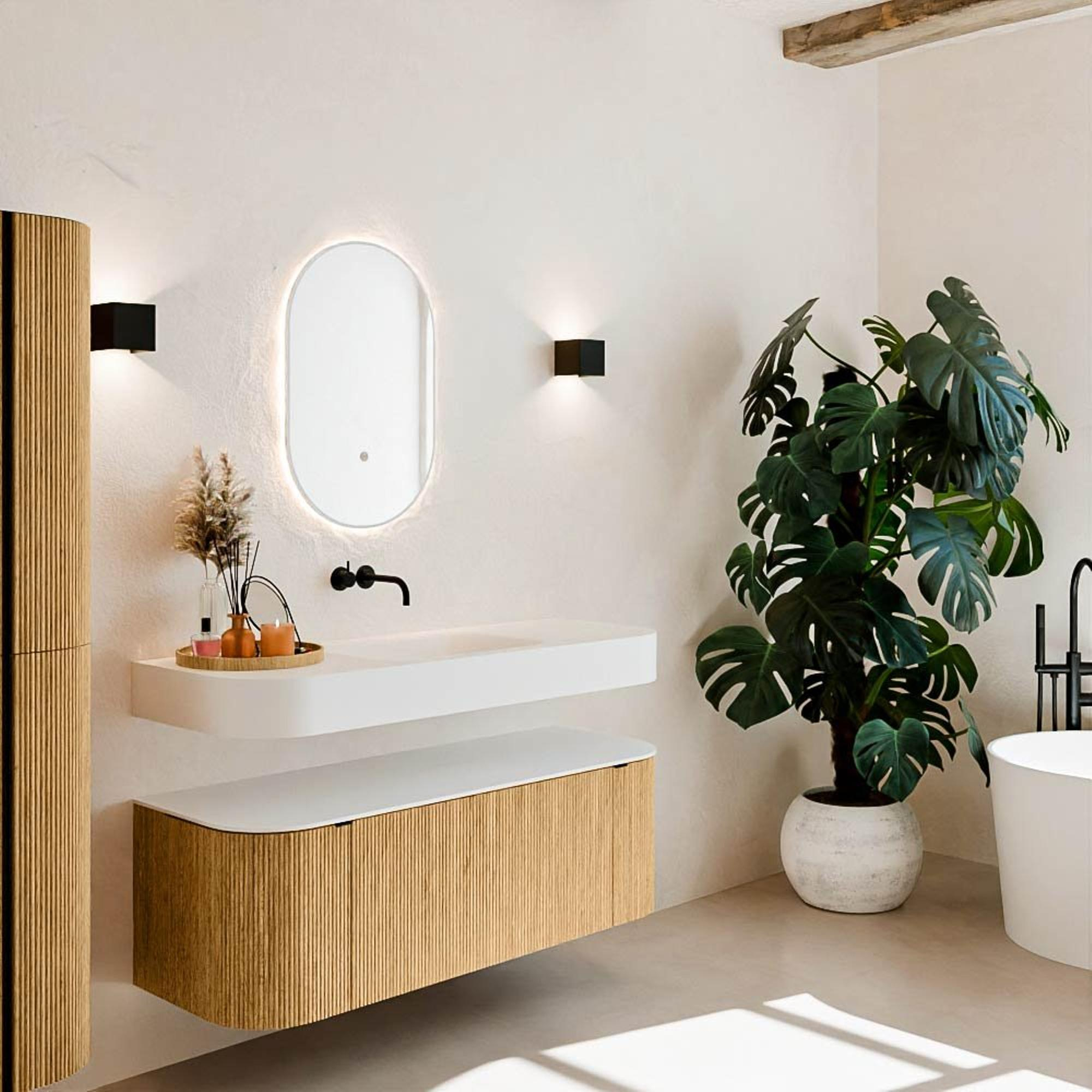 Au-dessus du meuble flotte une vasque suspendue assortie aux coins arrondis – parfaitement adaptée à la forme du meuble. La vasque est en Solid Surface et suit subtilement les lignes du meuble inférieur, créant une harmonie parfaite. Le plan de travail en Solid Surface constitue une base solide et facile d'entretien, complétant l'ensemble.
