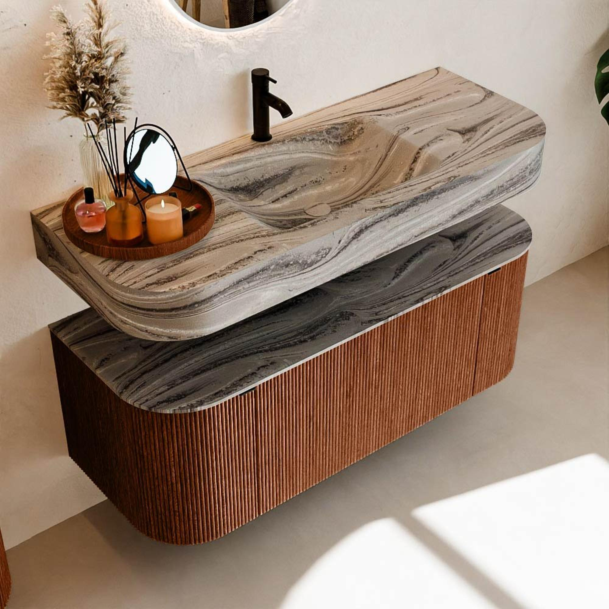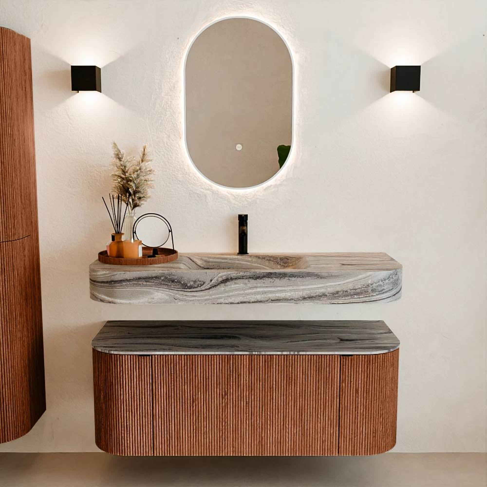 Matériaux naturels dans des tons chauds. Les nervures verticales apportent rythme et texture au design, tandis que le chêne confère une apparence chaleureuse et artisanale. Choisissez parmi 5 teintes de bois OAK, WALNUT, DUSK, SHADOW et RUBY, des couleurs de bois soigneusement sélectionnées pour enrichir les salles de bains modernes et classiques.