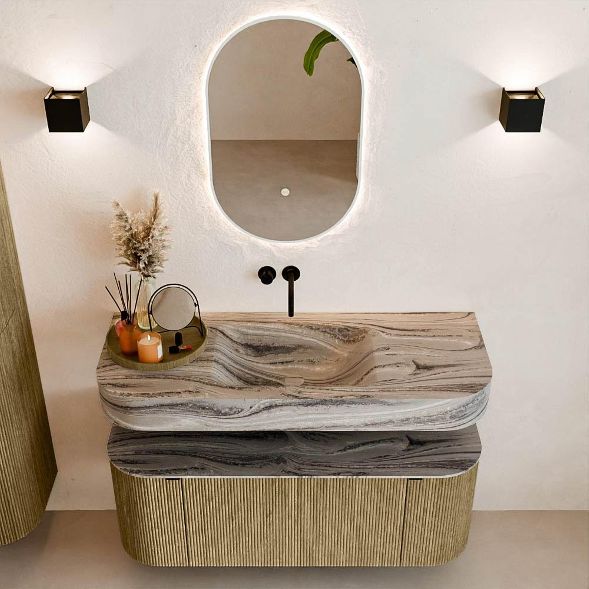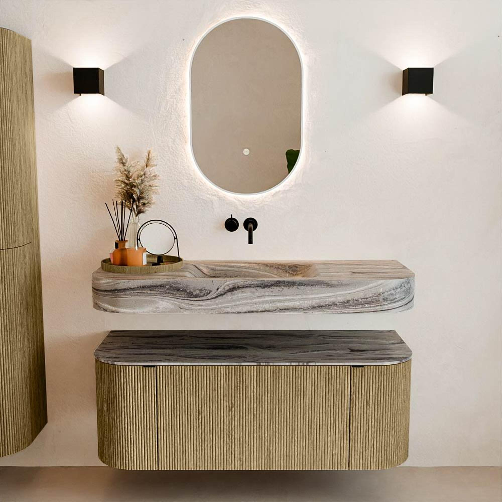 Matériaux naturels dans des tons chauds. Les nervures verticales apportent rythme et texture au design, tandis que le chêne confère une apparence chaleureuse et artisanale. Choisissez parmi 5 teintes de bois OAK, WALNUT, DUSK, SHADOW et RUBY, des couleurs de bois soigneusement sélectionnées pour enrichir les salles de bains modernes et classiques.