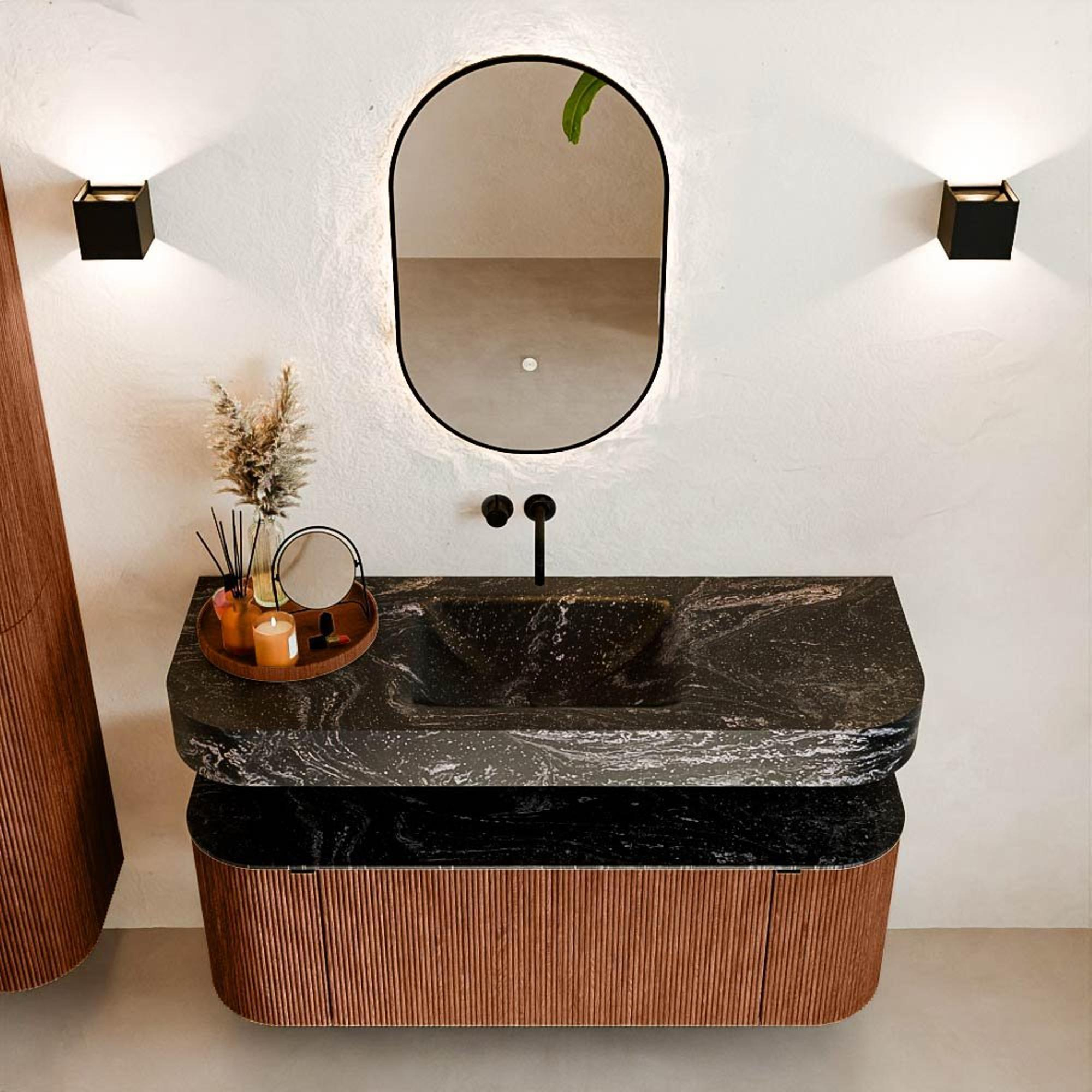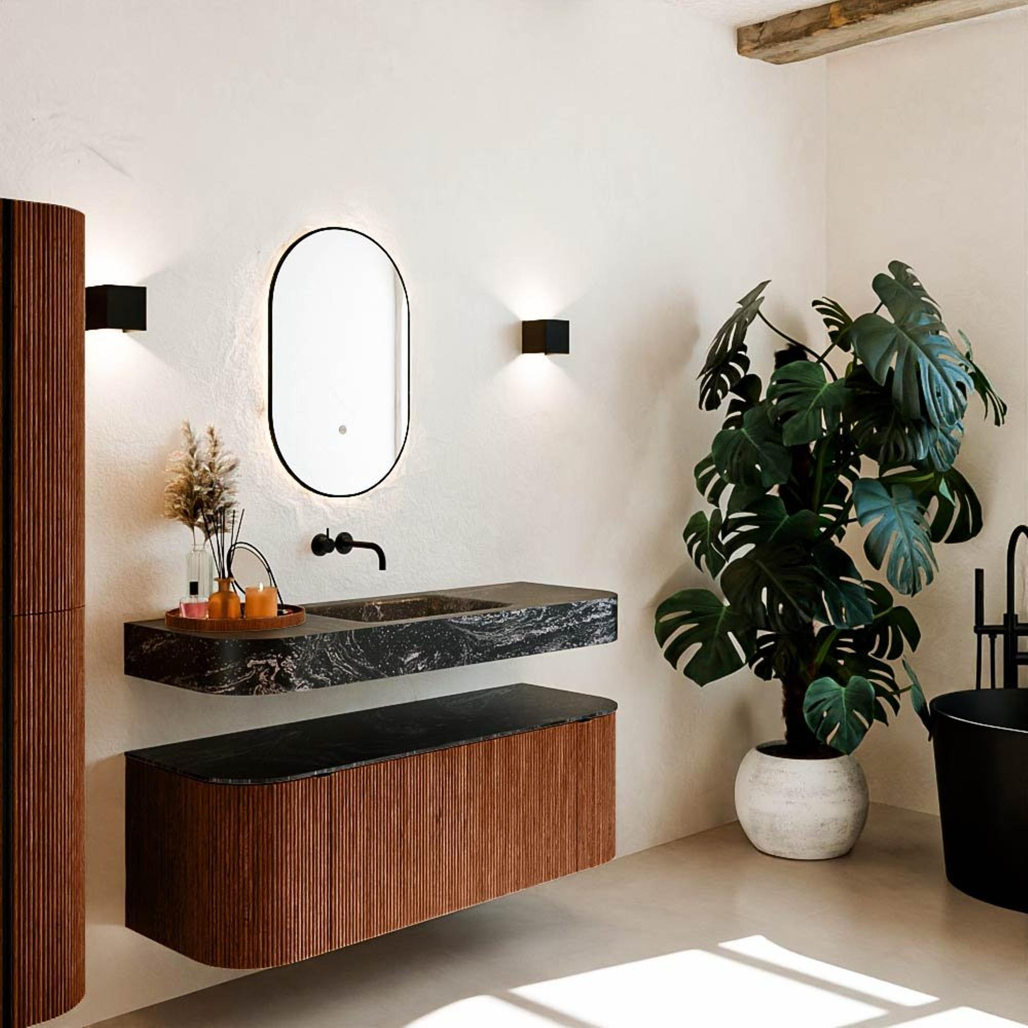 Matériaux naturels dans des tons chauds. Les nervures verticales apportent rythme et texture au design, tandis que le chêne confère une apparence chaleureuse et artisanale. Choisissez parmi 5 teintes de bois OAK, WALNUT, DUSK, SHADOW et RUBY, des couleurs de bois soigneusement sélectionnées pour enrichir les salles de bains modernes et classiques.