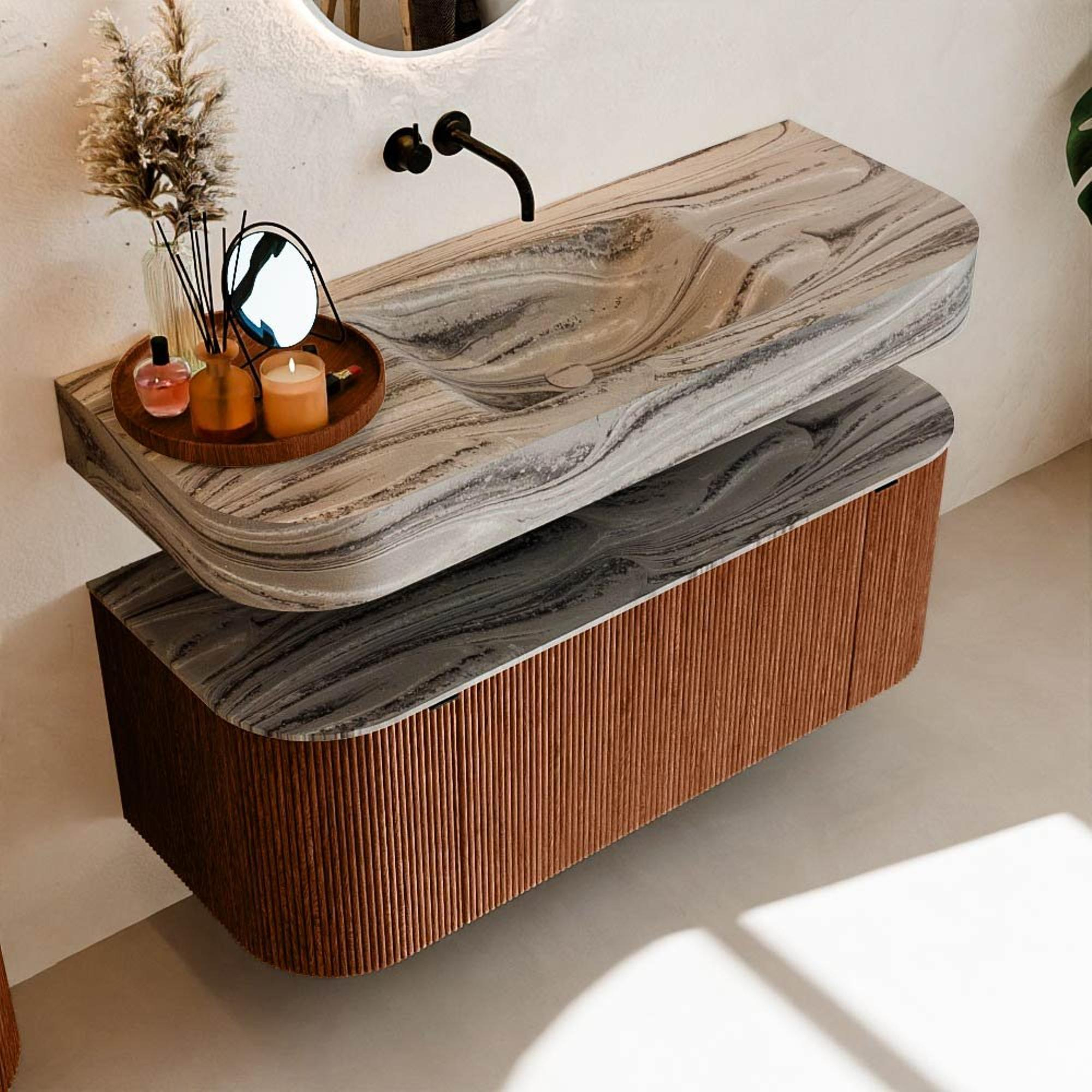 Au-dessus du meuble flotte une vasque suspendue assortie aux coins arrondis – parfaitement adaptée à la forme du meuble. La vasque est réalisée en Solid Surface et suit subtilement les lignes du meuble inférieur, créant ainsi un ensemble harmonieux. Le plan de travail en Solid Surface forme une base solide, facile d'entretien, et complète la combinaison.