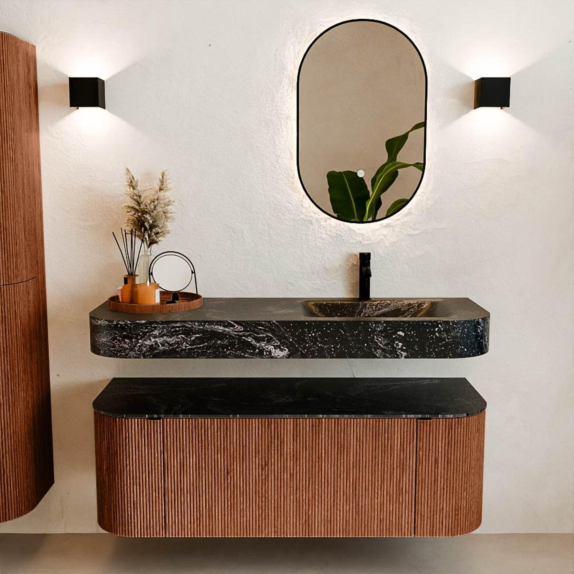 Au-dessus du meuble flotte une vasque suspendue assortie avec des angles arrondis – parfaitement adaptée à la forme du meuble. La vasque est en Solid Surface et suit subtilement les lignes du meuble inférieur, créant un ensemble harmonieux. Le plan de travail en Solid Surface constitue une base solide et facile d'entretien et complète la combinaison.