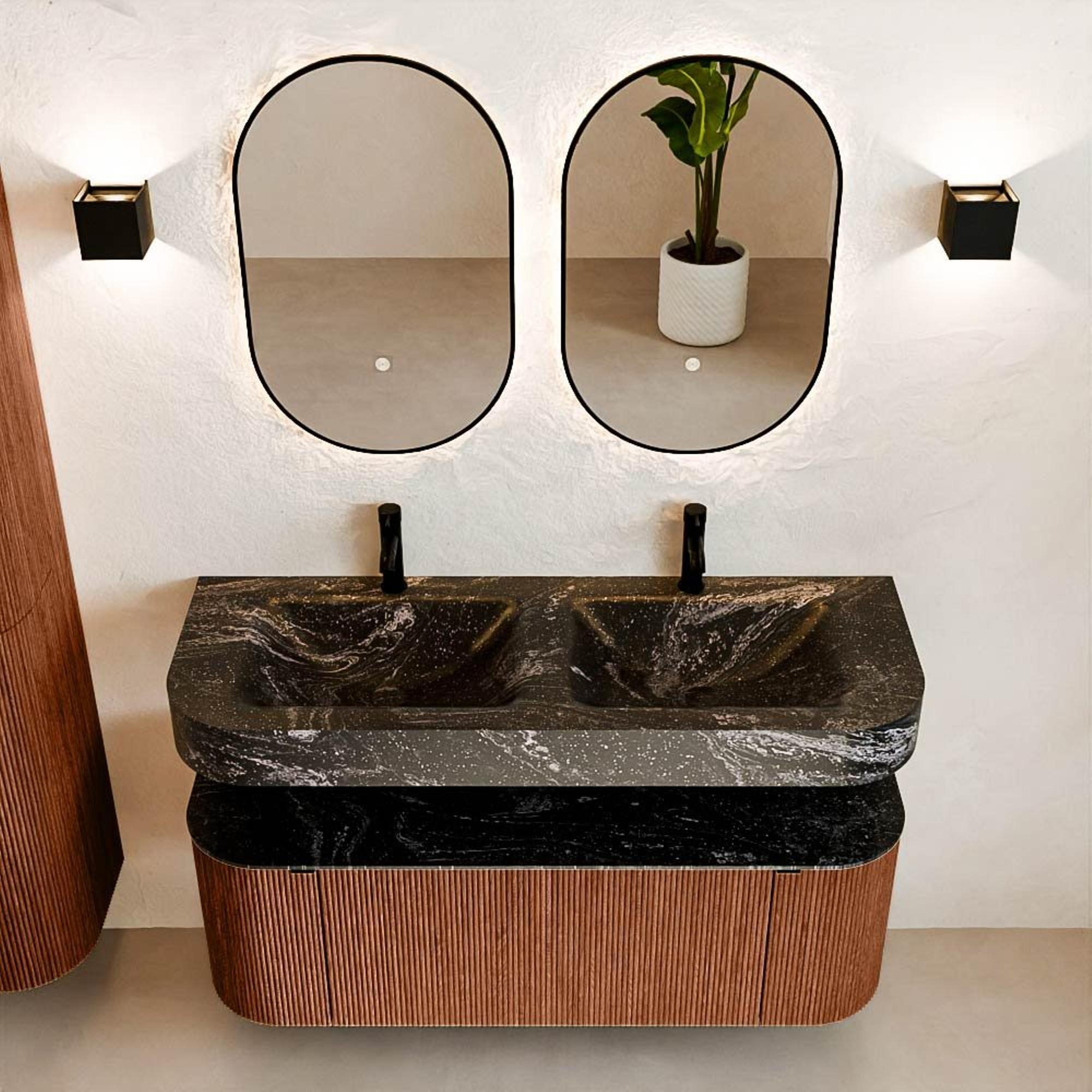 MONDIAZ THOR-DLUX 130cm meuble de salle de bains arrondi gauche + droite couleur Ruby avec 1 tiroir et 2 portes. Vasque suspendue CLOUD Double 2 trous de robinet couleur Lava.