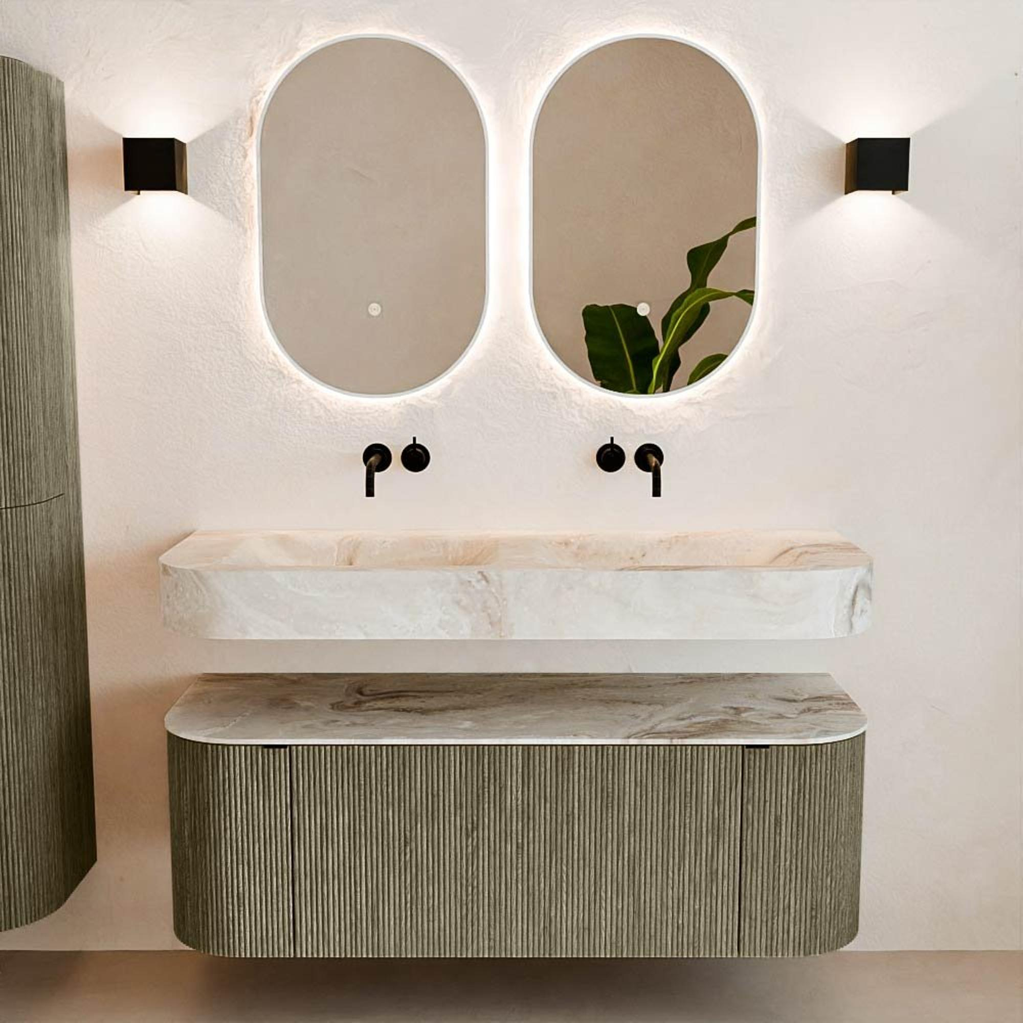 Matériaux naturels dans des tons chauds. Les nervures verticales apportent rythme et texture au design, tandis que le chêne confère une apparence chaleureuse et artisanale. Choisissez parmi 5 teintes de bois OAK, WALNUT, DUSK, SHADOW et RUBY, des couleurs de bois soigneusement sélectionnées pour enrichir les salles de bains modernes et classiques.