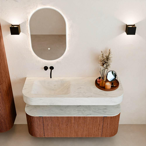 Au-dessus du meuble flotte une vasque suspendue assortie aux coins arrondis – parfaitement adaptée à la forme du meuble. La vasque est réalisée en Solid Surface et suit subtilement les lignes du meuble inférieur, créant ainsi un ensemble harmonieux. Le plan de travail en Solid Surface forme une base solide, facile d'entretien et complète la combinaison.
