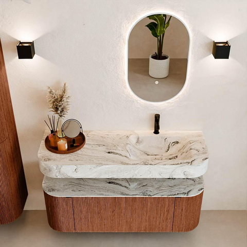 Au-dessus du meuble flotte une vasque suspendue assortie avec des coins arrondis – parfaitement adaptée à la forme du meuble. La vasque est en Solid Surface et suit subtilement les lignes du meuble inférieur, créant un ensemble harmonieux. Le plan de travail en Solid Surface constitue une base solide et facile d'entretien et complète la combinaison.