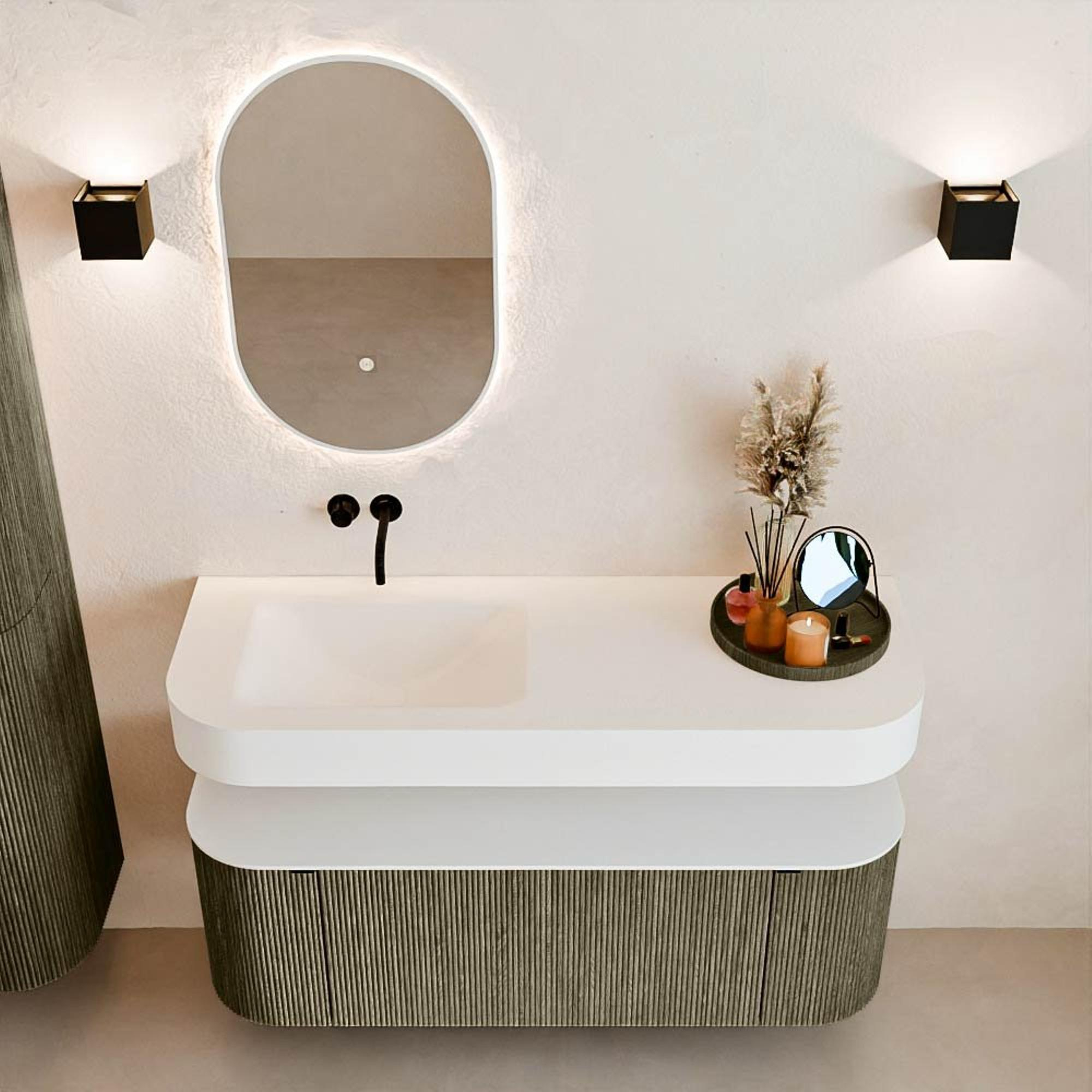 Au-dessus du meuble flotte une vasque suspendue assortie aux coins arrondis – parfaitement adaptée à la forme du meuble. La vasque est en Solid Surface et suit subtilement les lignes du meuble inférieur, créant un ensemble harmonieux. Le plan de travail en Solid Surface constitue une base solide et facile d’entretien, complétant la combinaison.