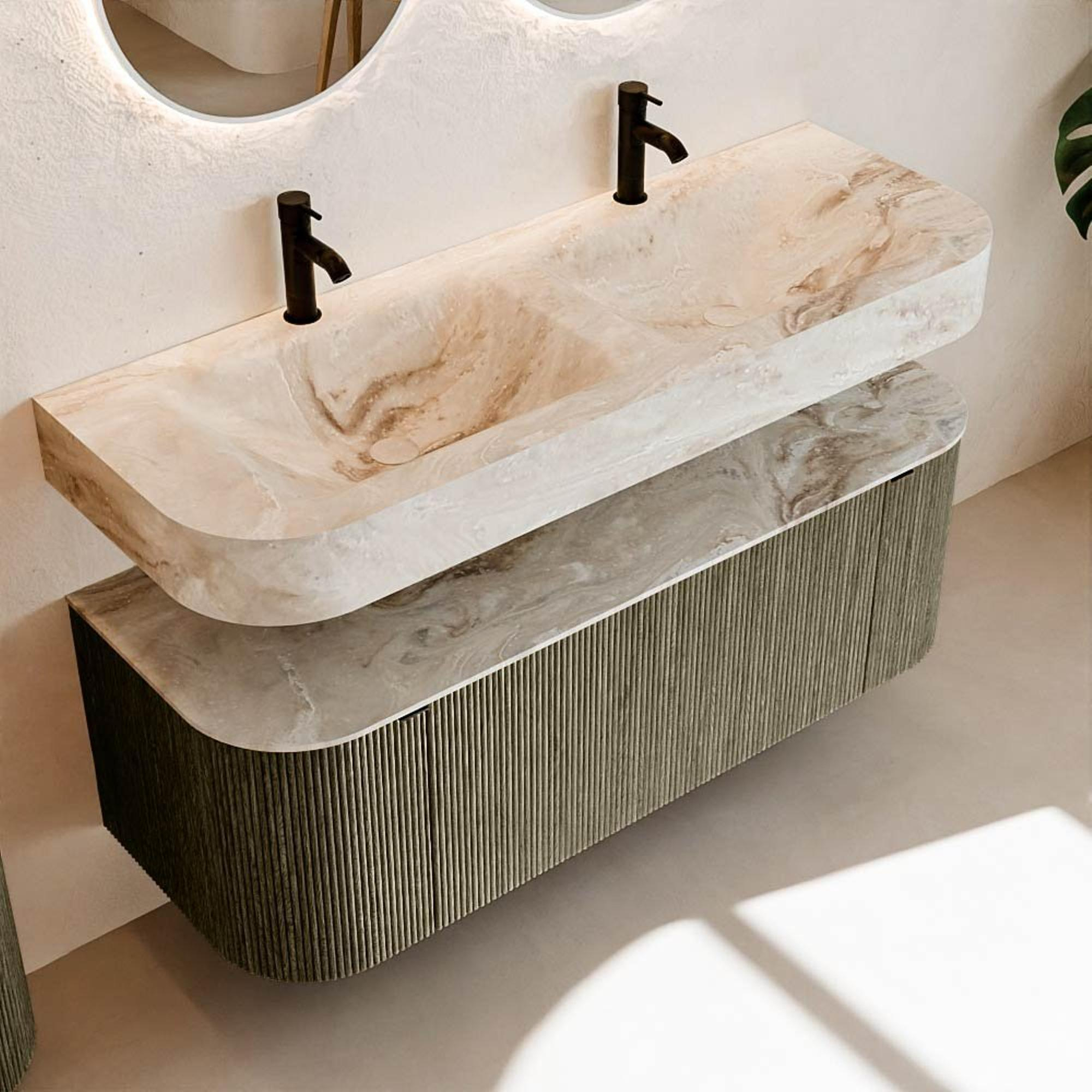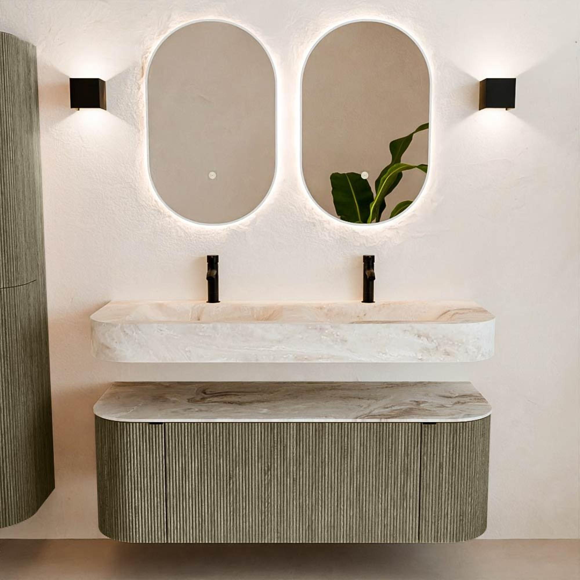 Matériaux naturels dans des tons chauds. Les nervures verticales apportent rythme et texture au design, tandis que le chêne confère une apparence chaleureuse et artisanale. Choisissez parmi 5 teintes de bois OAK, WALNUT, DUSK, SHADOW et RUBY, des couleurs de bois soigneusement sélectionnées pour enrichir les salles de bains modernes et classiques.