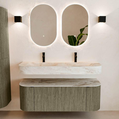 Au-dessus du meuble flotte une vasque suspendue assortie aux coins arrondis – parfaitement adaptée à la forme du meuble. La vasque est réalisée en Solid Surface et suit subtilement les lignes du meuble inférieur, créant ainsi un ensemble harmonieux. Le plan de travail en Solid Surface forme une base solide et facile d'entretien et complète la combinaison.