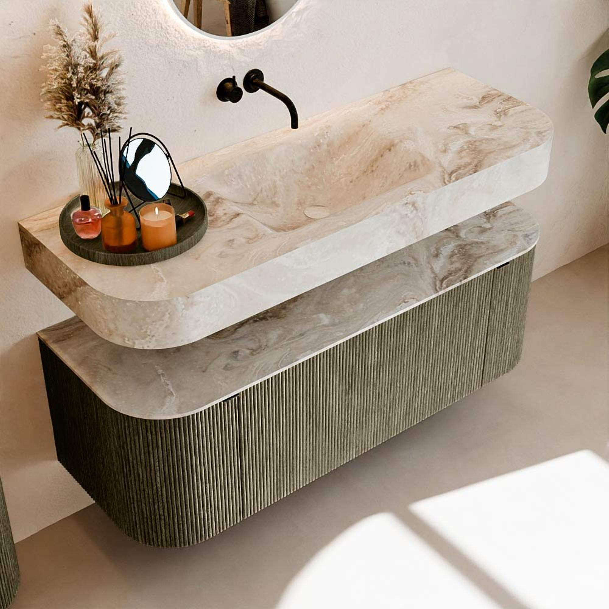 Au-dessus du meuble flotte une vasque suspendue assortie aux coins arrondis – parfaitement adaptée à la forme du meuble. La vasque est réalisée en Solid Surface et suit subtilement les lignes du meuble inférieur, créant ainsi un ensemble harmonieux. Le plan de travail en Solid Surface forme une base solide et facile d'entretien et complète la combinaison.