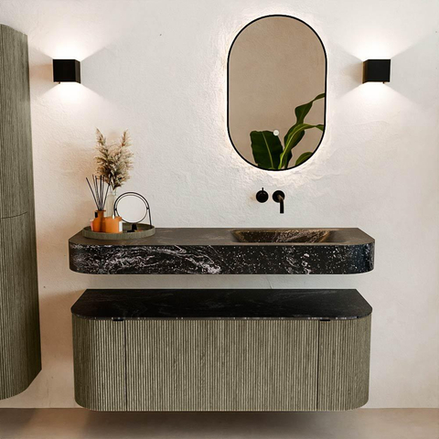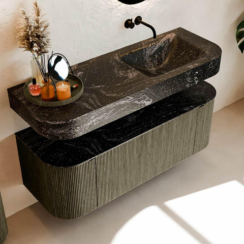 MONDIAZ THOR-DLUX 130cm meuble de salle de bains arrondi gauche + droite couleur Shadow avec 1 tiroir et 2 portes. Vasque suspendue CLOUD Droite sans trou de robinet couleur Lava.