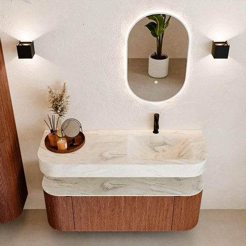 MONDIAZ THOR-DLUX 130cm meuble de salle de bains arrondi gauche + droite couleur Ruby avec 1 tiroir et 2 portes. Vasque suspendue CLOUD Droite 1 trou de robinet couleur Ostra.