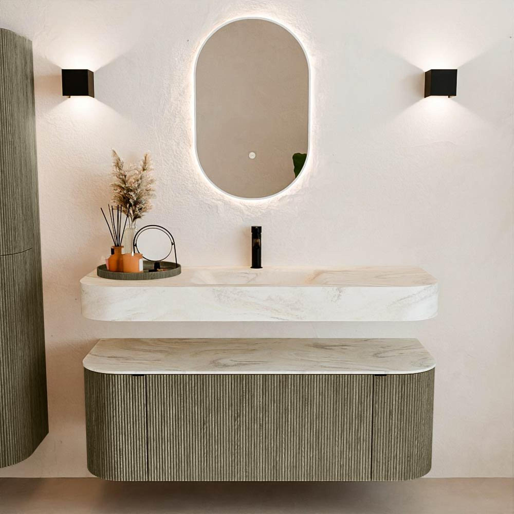 Matériaux naturels dans des tons chauds. Les nervures verticales apportent rythme et texture au design, tandis que le chêne confère une apparence chaleureuse et artisanale. Choisissez parmi 5 teintes de bois OAK, WALNUT, DUSK, SHADOW et RUBY, des couleurs de bois soigneusement sélectionnées pour enrichir les salles de bains modernes et classiques.
