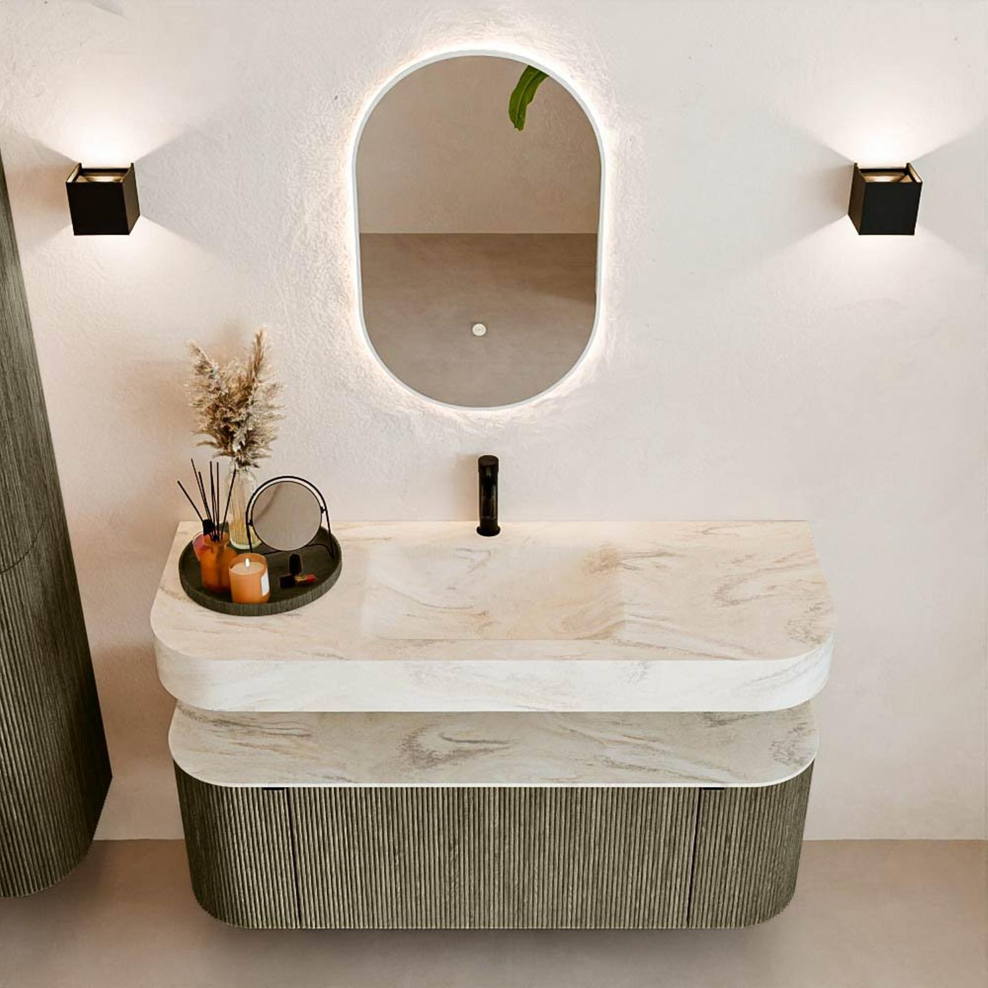Au-dessus du meuble flotte une vasque suspendue assortie aux coins arrondis – parfaitement adaptée à la forme du meuble. La vasque est réalisée en Solid Surface et suit subtilement les lignes du meuble sous-jacent, créant ainsi un ensemble harmonieux. Le plan de travail en Solid Surface constitue une base solide, facile d'entretien et complète la combinaison.