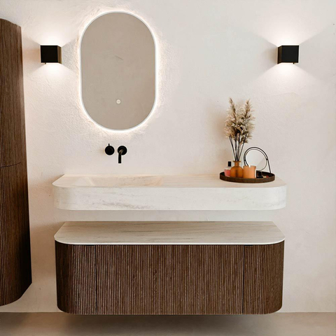 Au-dessus du meuble flotte une vasque suspendue assortie aux coins arrondis – parfaitement adaptée à la forme du meuble. La vasque est en Solid Surface et suit subtilement les lignes du meuble inférieur, créant ainsi un ensemble harmonieux. Le plan de travail en Solid Surface forme une base solide, facile d'entretien, et complète la combinaison.