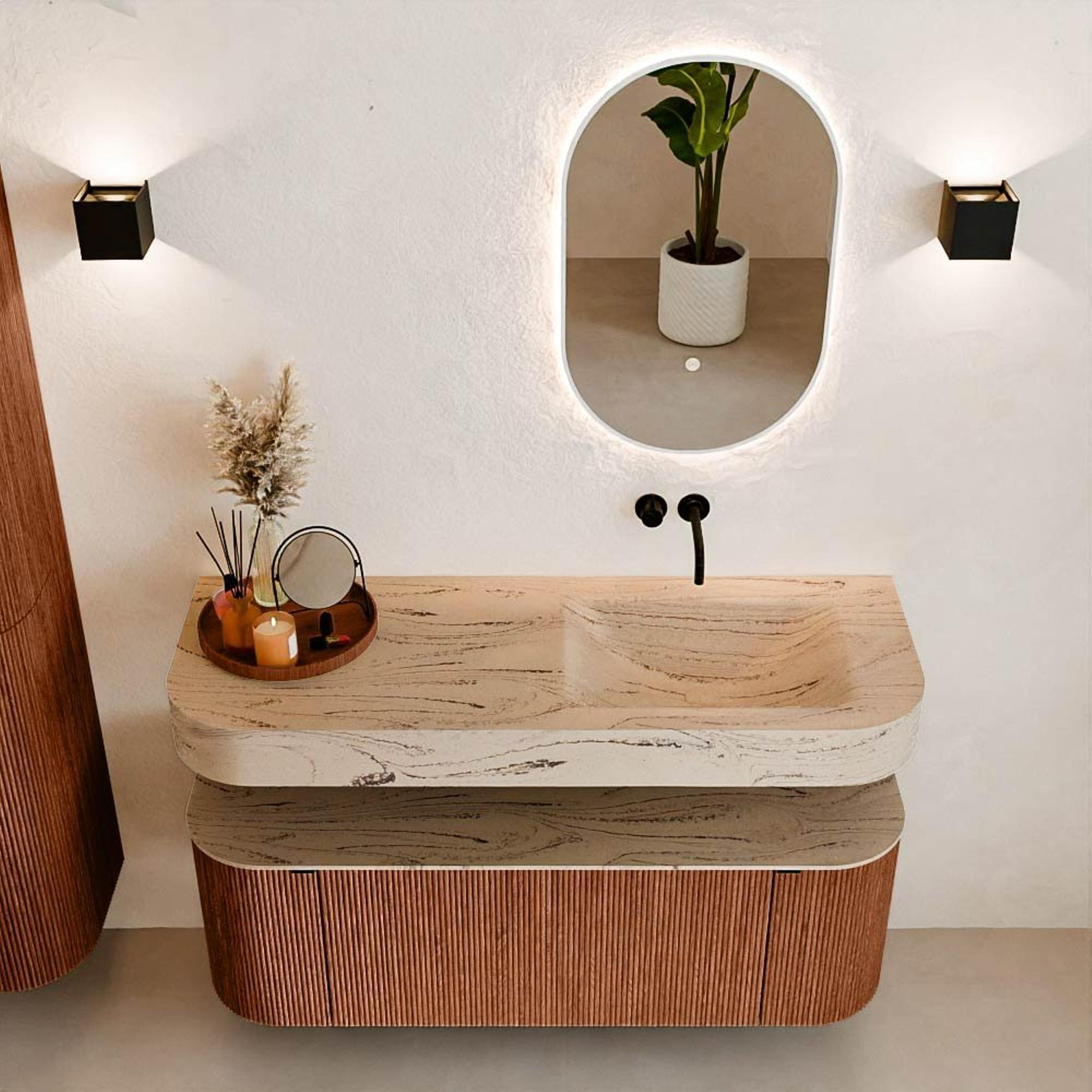 Matériaux naturels dans des tons chauds. Les nervures verticales apportent rythme et texture au design, tandis que le chêne confère une apparence chaleureuse et artisanale. Choisissez parmi 5 teintes de bois OAK, WALNUT, DUSK, SHADOW et RUBY, des couleurs de bois soigneusement sélectionnées pour enrichir les salles de bains modernes et classiques.