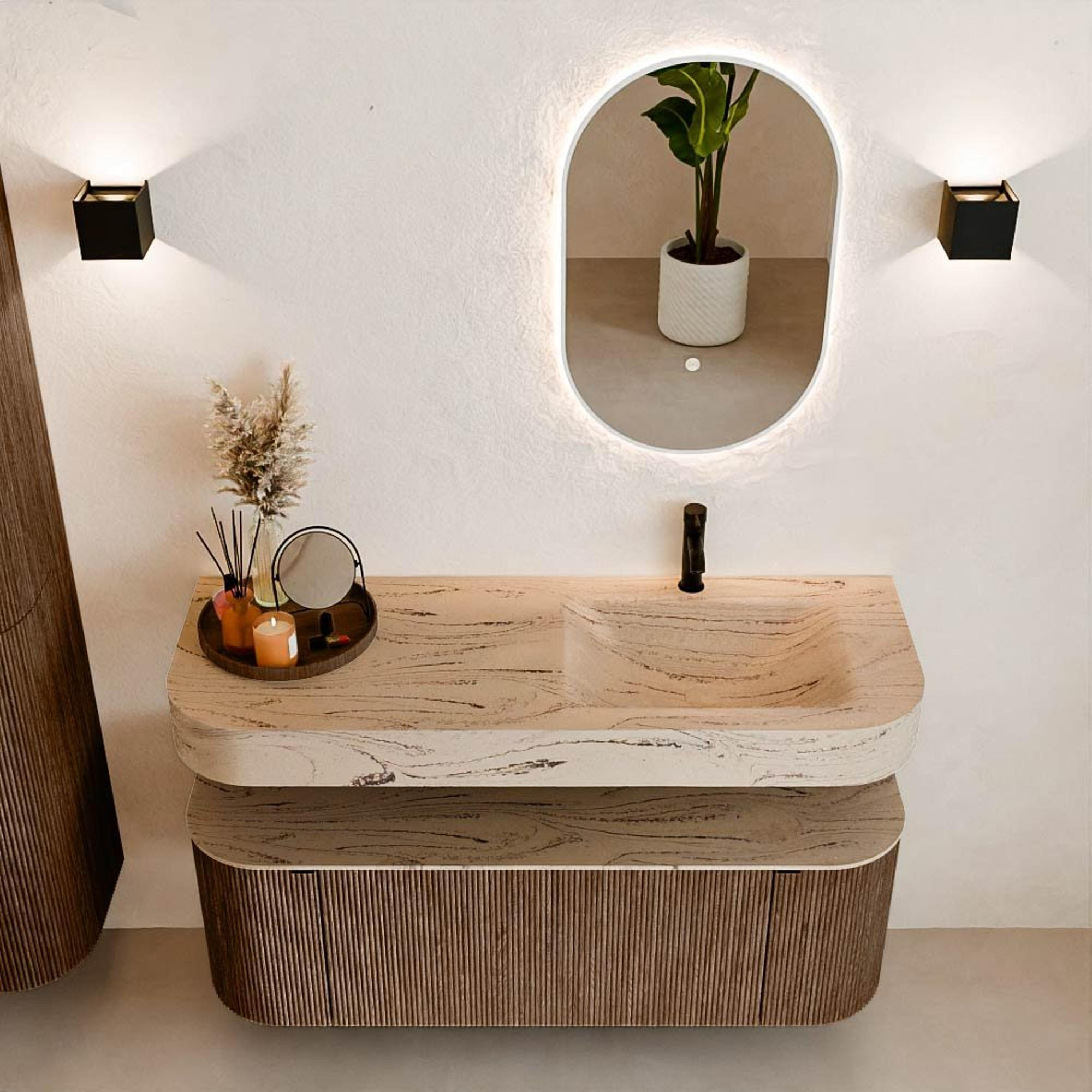 Matériaux naturels dans des tons chauds. Les rainures verticales apportent rythme et texture au design, tandis que le chêne confère une apparence chaleureuse et artisanale. Choisissez parmi 5 teintes de bois OAK, WALNUT, DUSK, SHADOW et RUBY, des couleurs de bois soigneusement sélectionnées pour enrichir les salles de bains modernes et classiques.