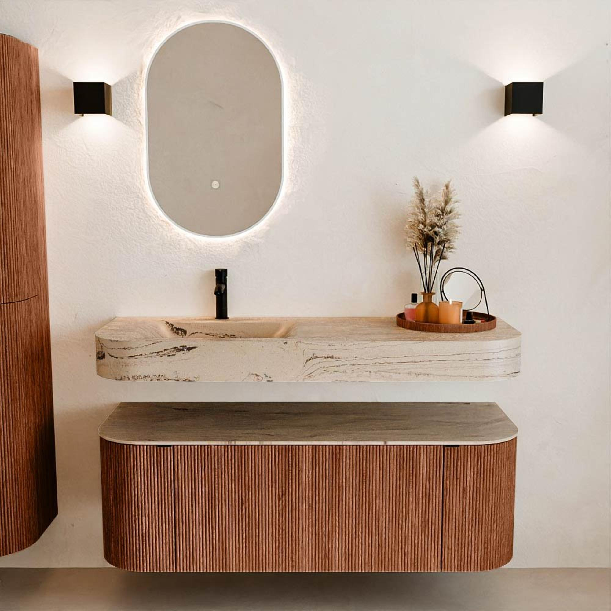 Matériaux naturels dans des tons chauds. Les cannelures verticales apportent rythme et texture au design, tandis que le chêne confère une apparence chaleureuse et artisanale. Choisissez parmi 5 teintes de bois OAK, WALNUT, DUSK, SHADOW et RUBY, des couleurs de bois soigneusement sélectionnées pour enrichir les salles de bains modernes et classiques.