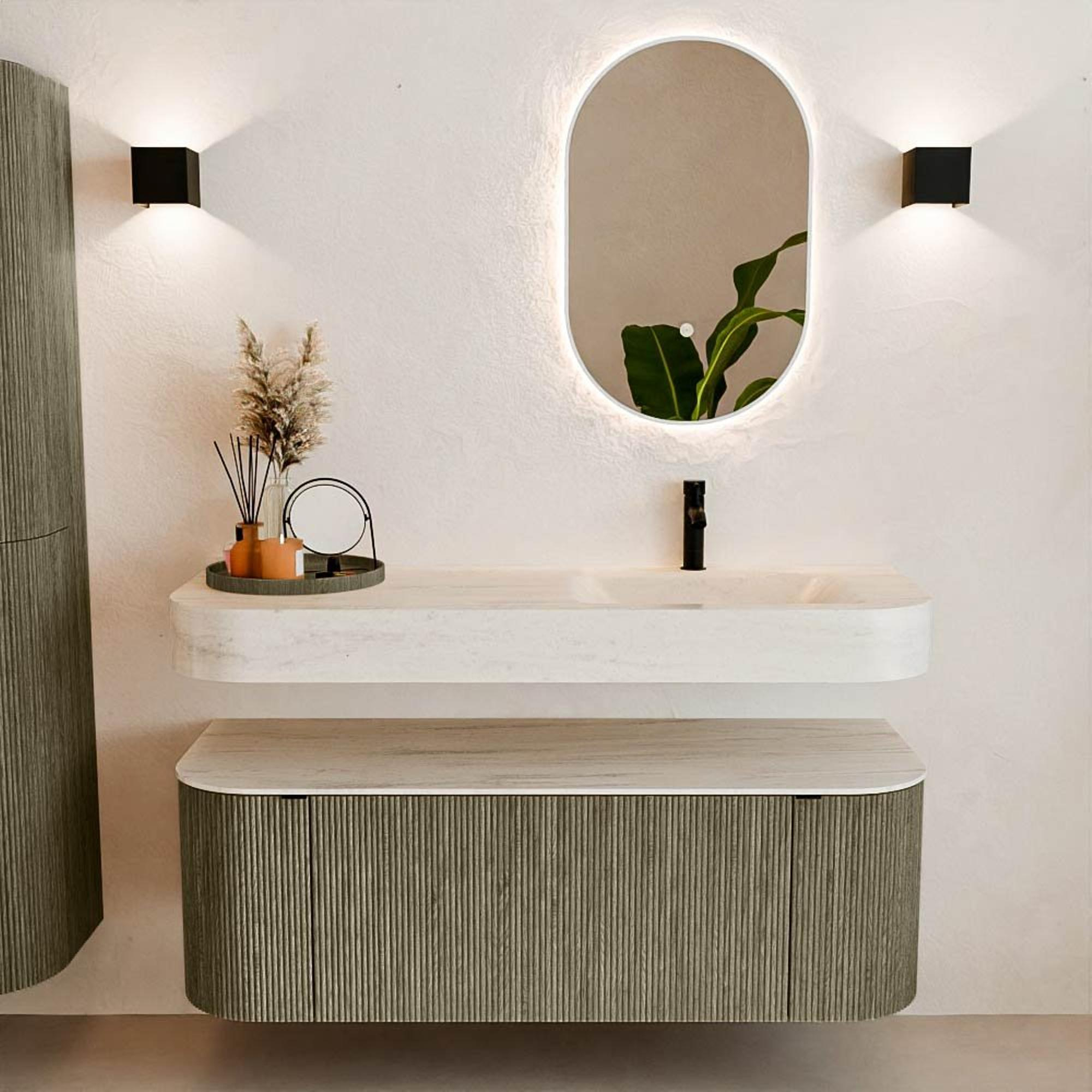 Matériaux naturels dans des tons chauds. Les nervures verticales apportent rythme et texture au design, tandis que le chêne confère une apparence chaleureuse et artisanale. Choisissez parmi 5 teintes de bois OAK, WALNUT, DUSK, SHADOW et RUBY, des couleurs de bois soigneusement sélectionnées pour enrichir les salles de bains modernes et classiques.