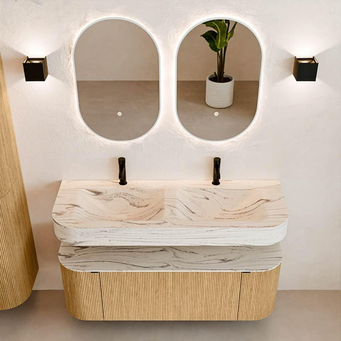 MONDIAZ THOR-DLUX 130cm meuble de salle de bains arrondi gauche + droite couleur Oak avec 1 tiroir et 2 portes. Vasque suspendue CLOUD Double 2 trous de robinet couleur Nata.