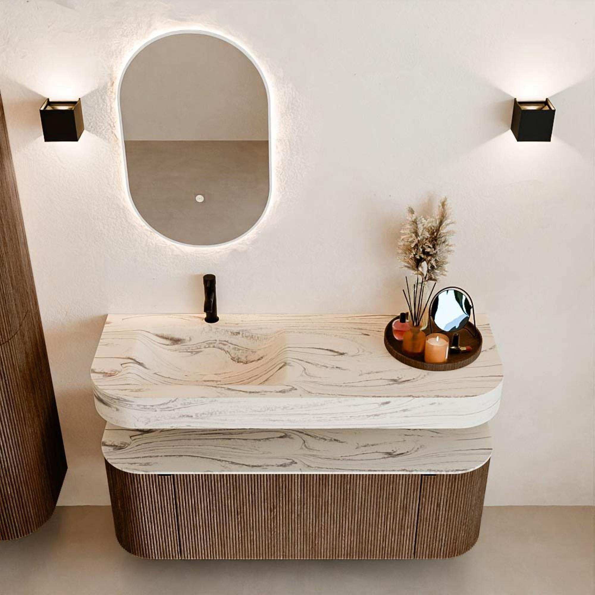 Matériaux naturels dans des tons chauds. Les reliefs verticaux apportent rythme et texture au design, tandis que le chêne confère une apparence chaleureuse et artisanale. Choisissez parmi 5 teintes de bois OAK, WALNUT, DUSK, SHADOW et RUBY, des couleurs de bois soigneusement sélectionnées pour enrichir les salles de bains modernes et classiques.