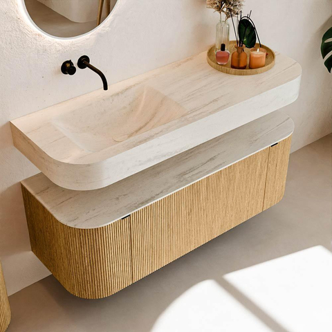 Au-dessus du meuble flotte une vasque suspendue assortie aux coins arrondis – parfaitement adaptée à la forme du meuble. La vasque est réalisée en Solid Surface et suit subtilement les lignes du meuble inférieur, créant un ensemble harmonieux. Le plan de travail en Solid Surface constitue une base solide et facile d'entretien et complète la combinaison.