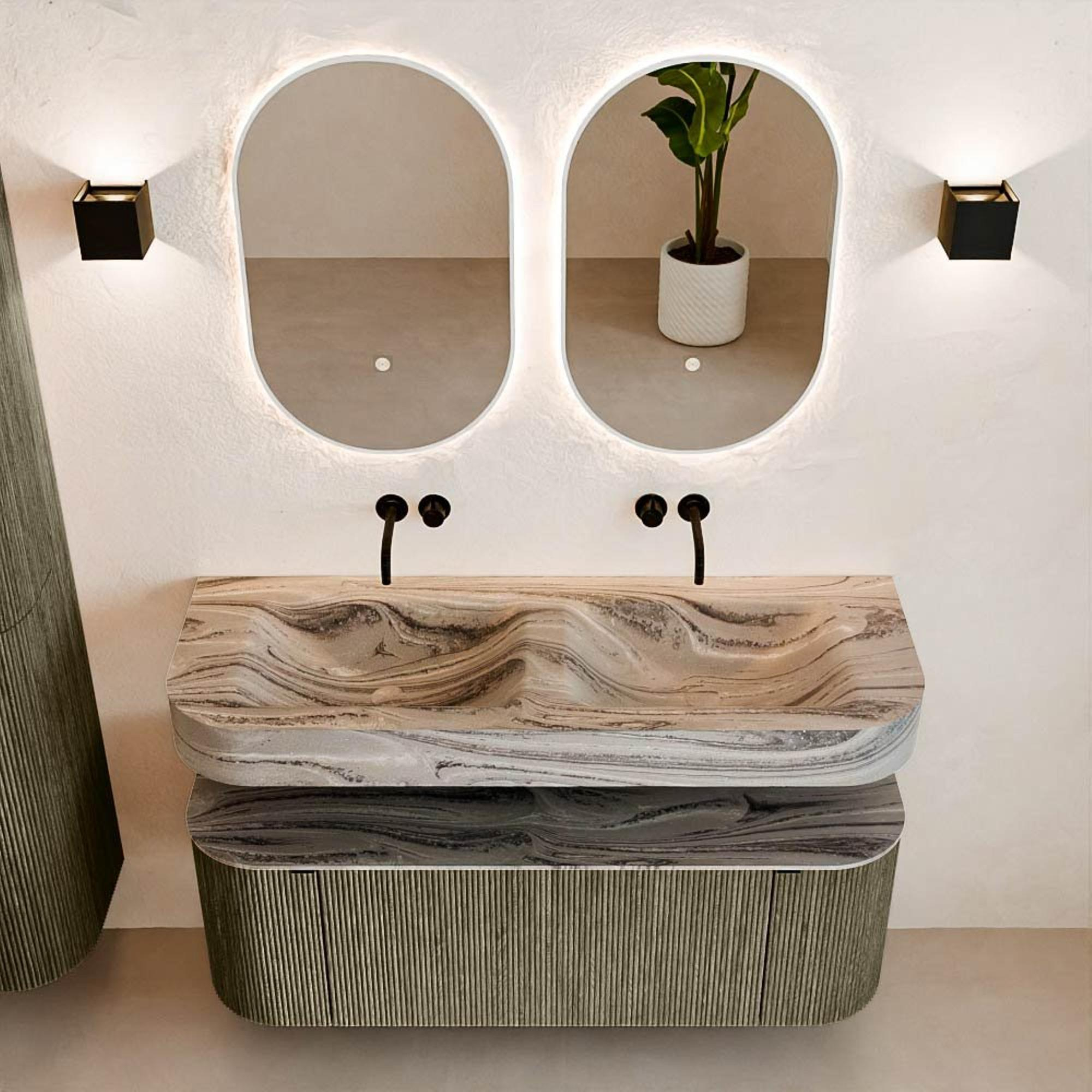 Matériaux naturels dans des tons chauds. Les nervures verticales apportent rythme et texture au design, tandis que le chêne confère une apparence chaleureuse et artisanale. Choisissez parmi 5 teintes de bois OAK, WALNUT, DUSK, SHADOW et RUBY, des couleurs de bois soigneusement sélectionnées pour enrichir les salles de bains modernes et classiques.