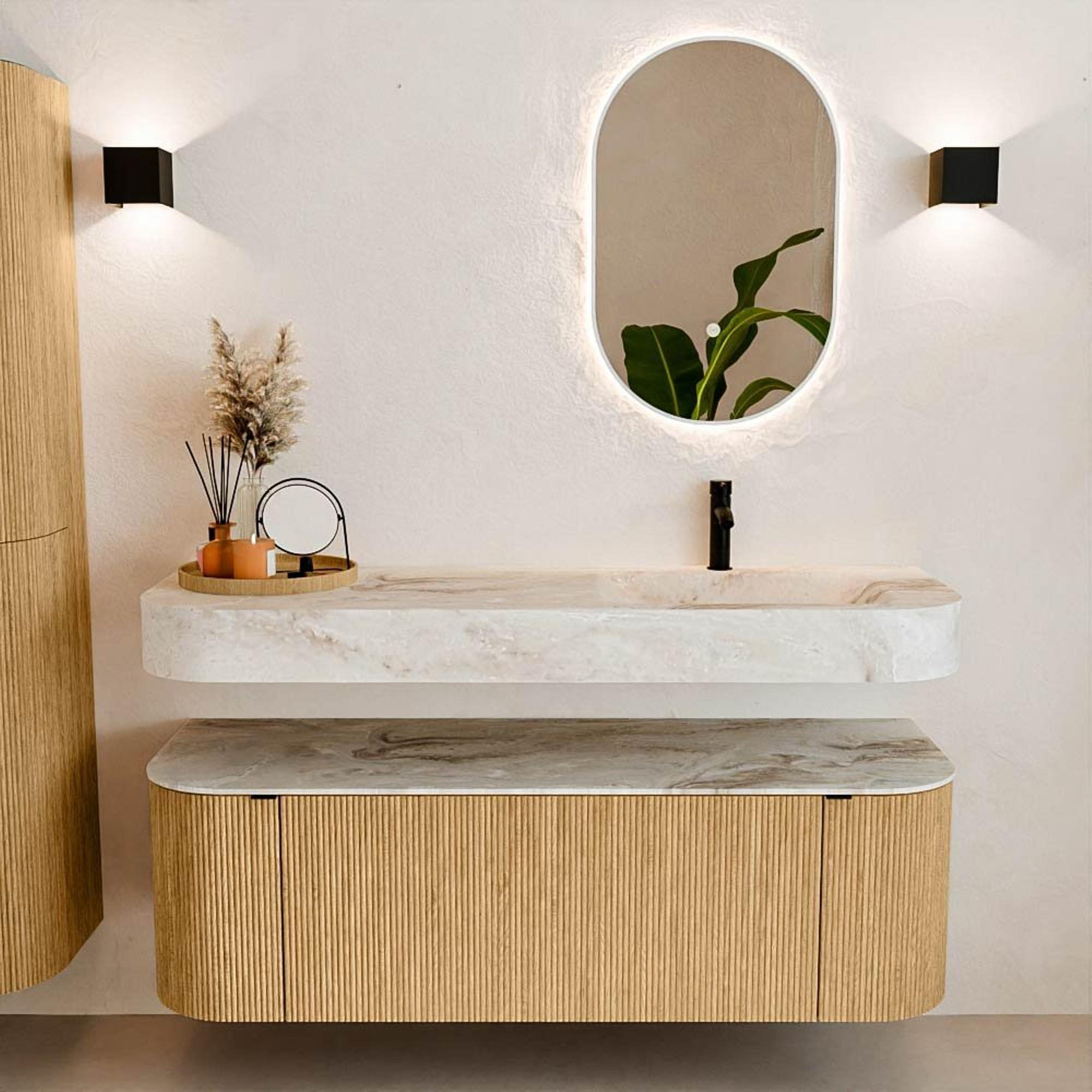 Matériaux naturels aux teintes chaudes. Les rainures verticales apportent rythme et texture au design, tandis que le chêne confère une apparence chaleureuse et artisanale. Choisissez parmi 5 teintes de bois OAK, WALNUT, DUSK, SHADOW et RUBY, des couleurs de bois soigneusement sélectionnées pour enrichir les salles de bains modernes et classiques.