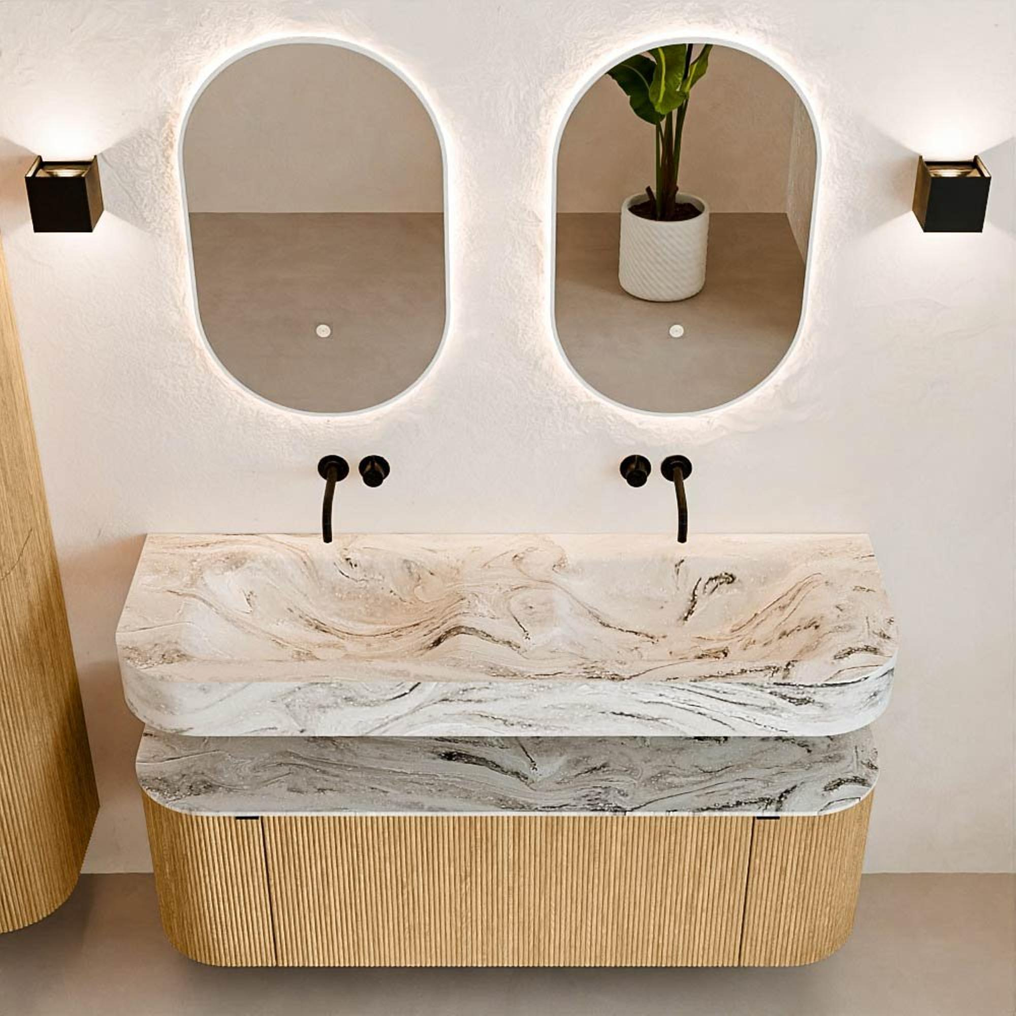 MONDIAZ THOR-DLUX 140cm meuble de salle de bains arrondi gauche + droite couleur Oak avec 1 tiroir et 2 portes. Vasque suspendue CLOUD Double sans trou de robinet couleur Glace.
