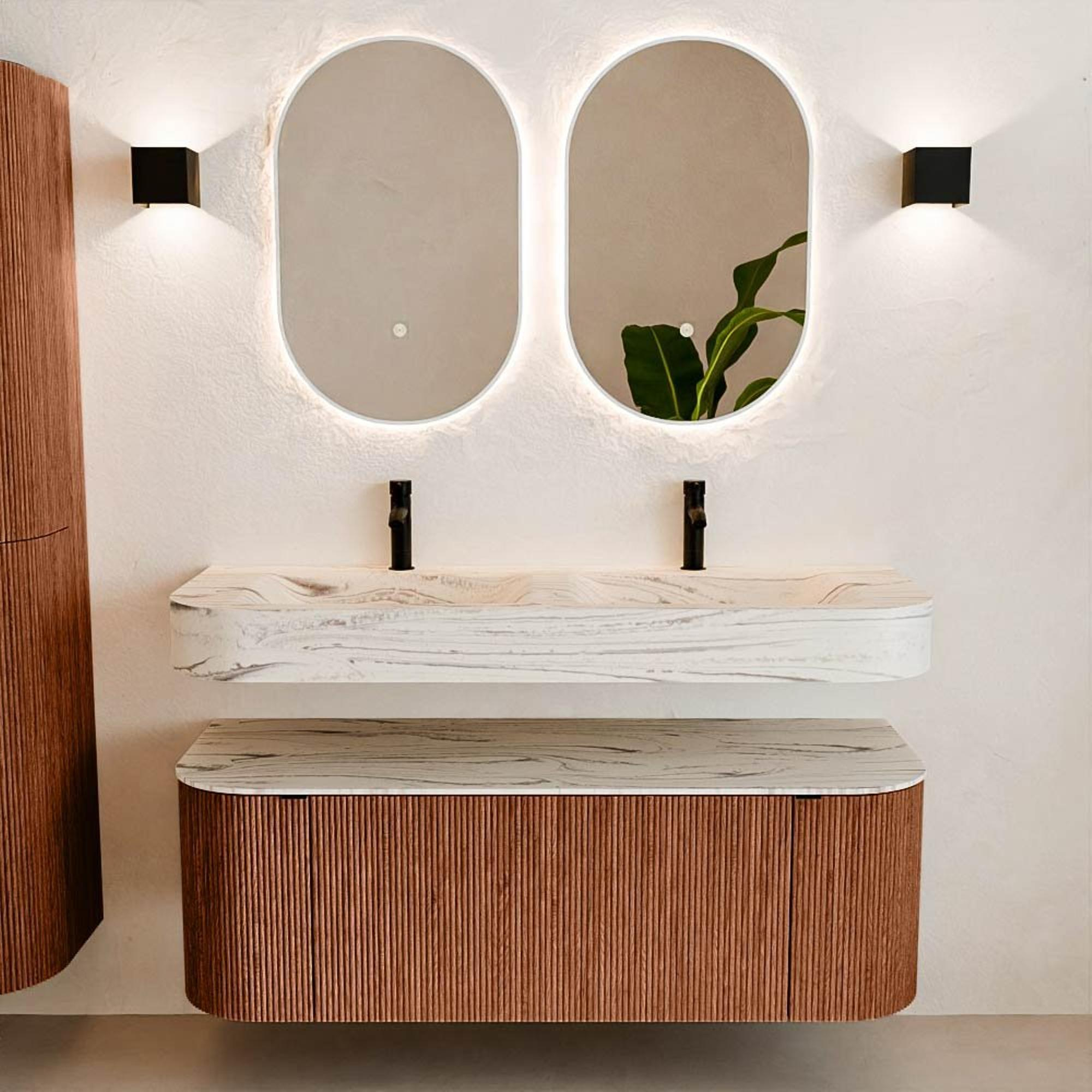 Matériaux naturels aux teintes chaudes. Les nervures verticales apportent rythme et texture au design, tandis que le chêne confère une apparence chaleureuse et artisanale. Choisissez parmi 5 teintes de bois OAK, WALNUT, DUSK, SHADOW et RUBY, des couleurs de bois soigneusement sélectionnées pour enrichir les salles de bains modernes et classiques.