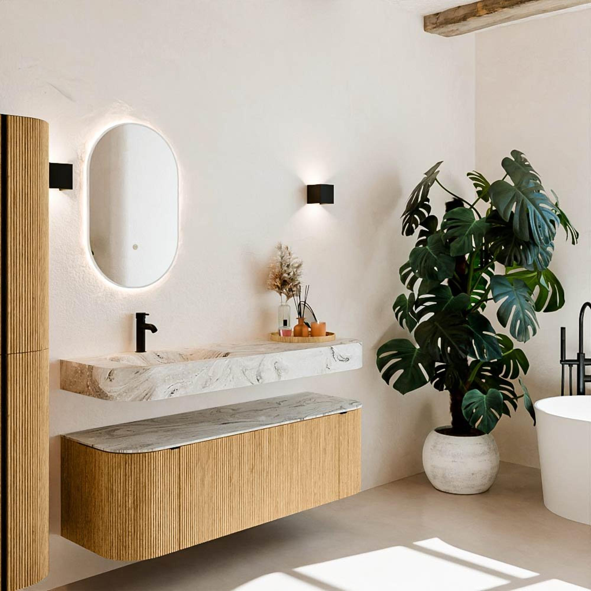 Matériaux naturels dans des tons chauds. Les reliefs verticaux apportent rythme et texture au design, tandis que le chêne confère une apparence chaleureuse et artisanale. Choisissez parmi 5 teintes de bois OAK, WALNUT, DUSK, SHADOW et RUBY, des couleurs de bois soigneusement sélectionnées pour enrichir les salles de bains modernes et classiques.