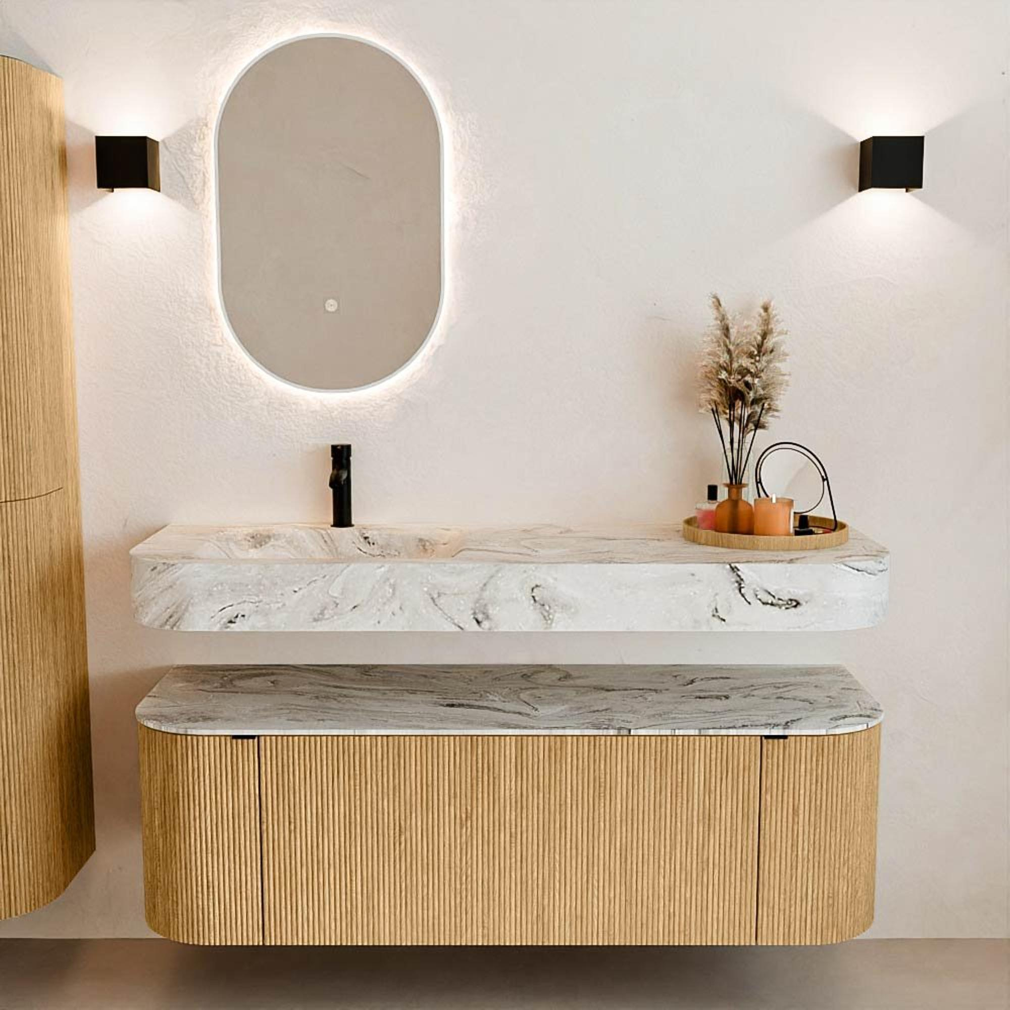 Au-dessus du meuble flotte une vasque suspendue assortie aux coins arrondis – parfaitement adaptée à la forme du meuble. La vasque est en Solid Surface et suit subtilement les lignes du meuble inférieur, créant un ensemble harmonieux. Le plan de travail en Solid Surface forme une base solide et facile d'entretien et complète la combinaison.