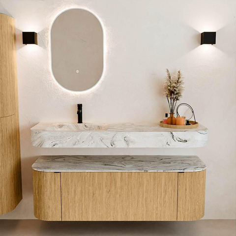 MONDIAZ THOR-DLUX Meuble de salle de bains 140cm arrondi gauche + droite couleur Oak avec 1 tiroir et 2 portes. Vasque suspendue CLOUD Gauche 1 trou de robinet couleur Glace.