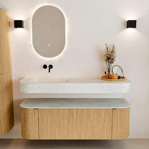 MONDIAZ THOR-DLUX Meuble de salle de bains 140cm arrondi gauche + droite couleur Oak avec 1 tiroir et 2 portes. Vasque suspendue CLOUD Gauche sans trou de robinet couleur Opalo.