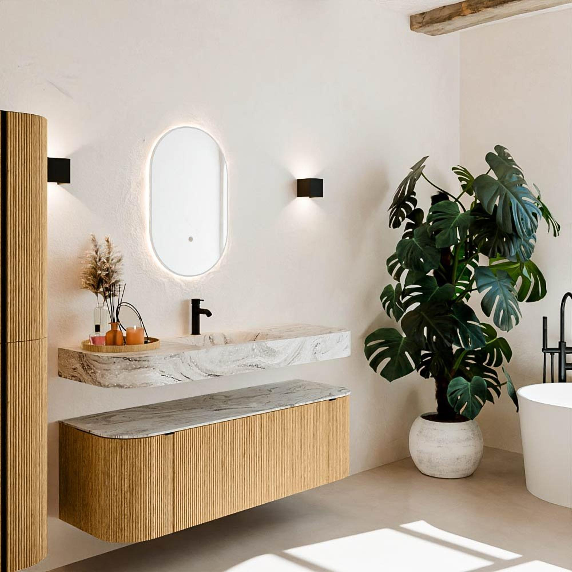 MONDIAZ THOR-DLUX 140cm meuble de salle de bains arrondi gauche + droite couleur Chêne avec 1 tiroir et 2 portes. Vasque suspendue CLOUD Milieu 1 trou de robinet couleur Glace.