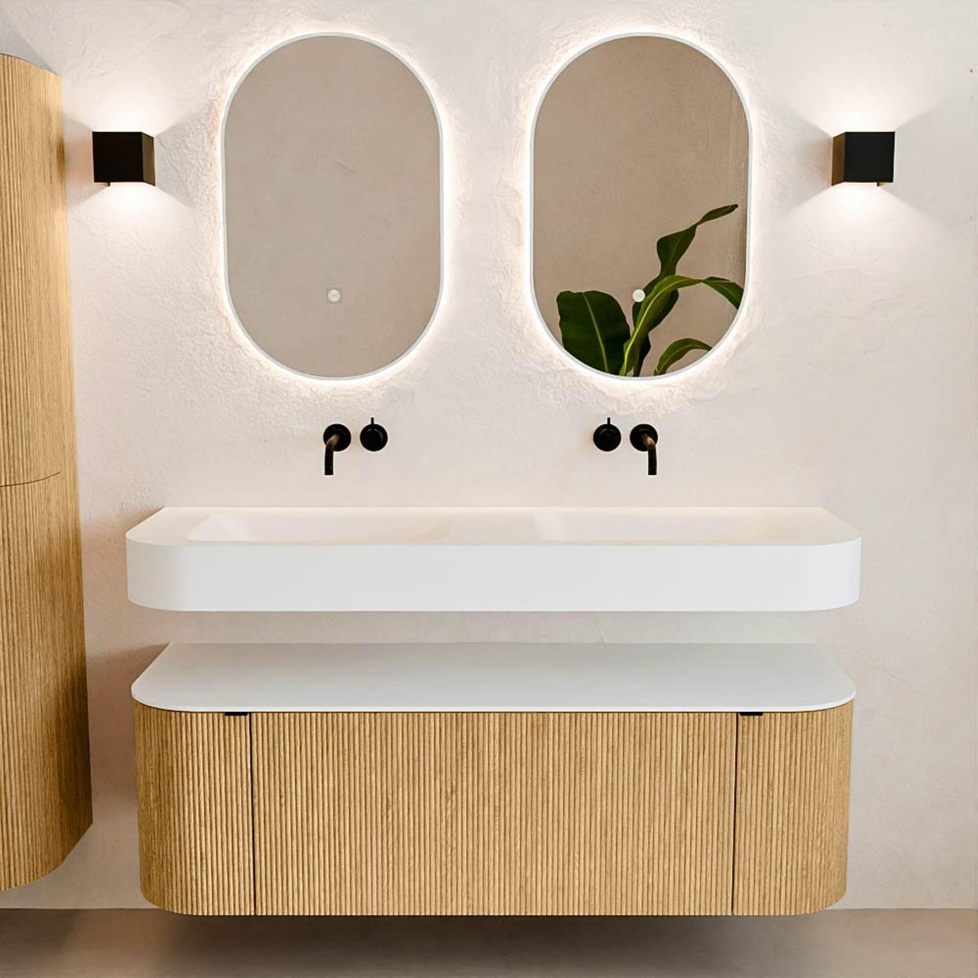 Matériaux naturels dans des tons chauds. Les nervures verticales apportent rythme et texture au design, tandis que le chêne confère une apparence chaleureuse et artisanale. Choisissez parmi 5 teintes de bois OAK, WALNUT, DUSK, SHADOW et RUBY, des couleurs de bois soigneusement sélectionnées pour enrichir les salles de bains modernes et classiques.