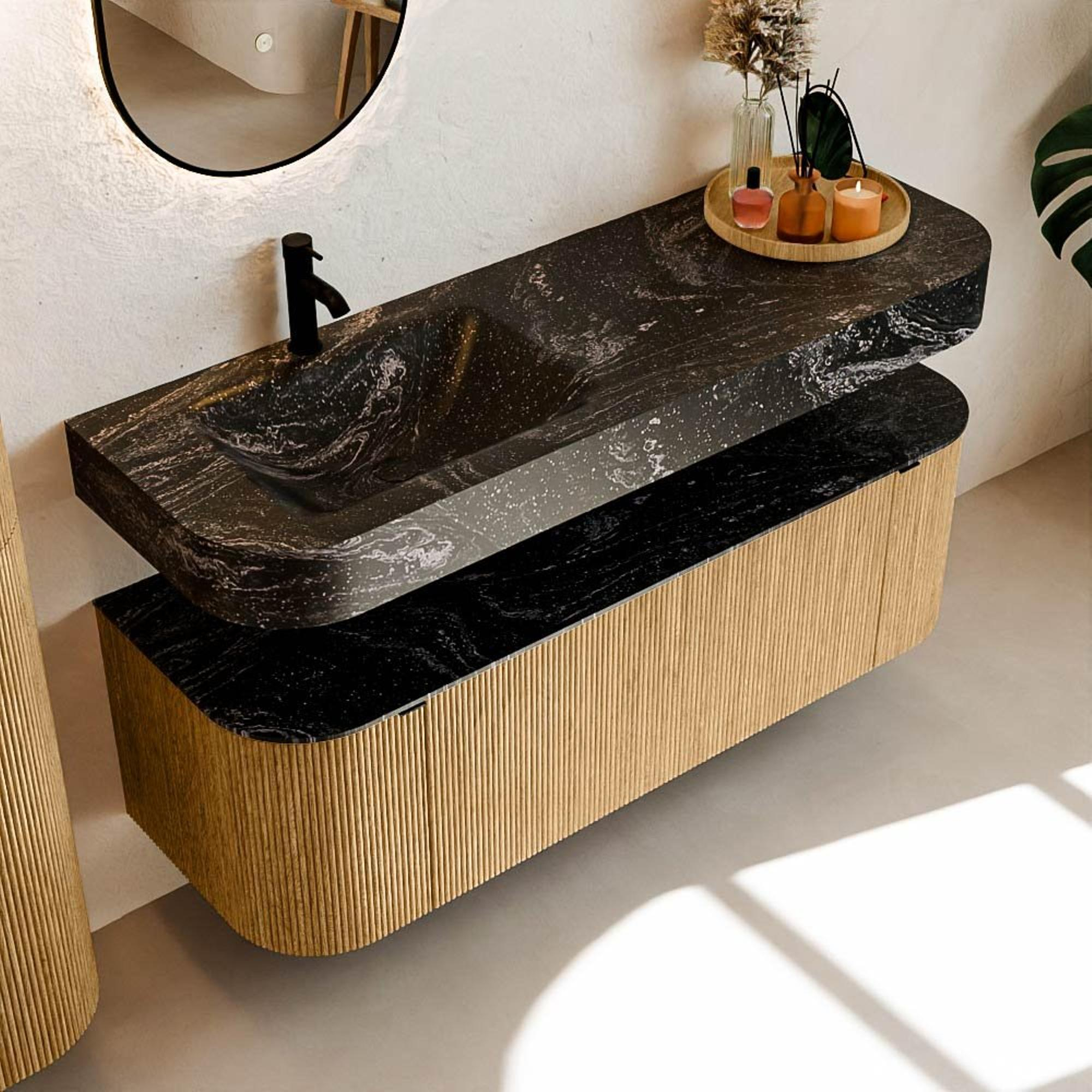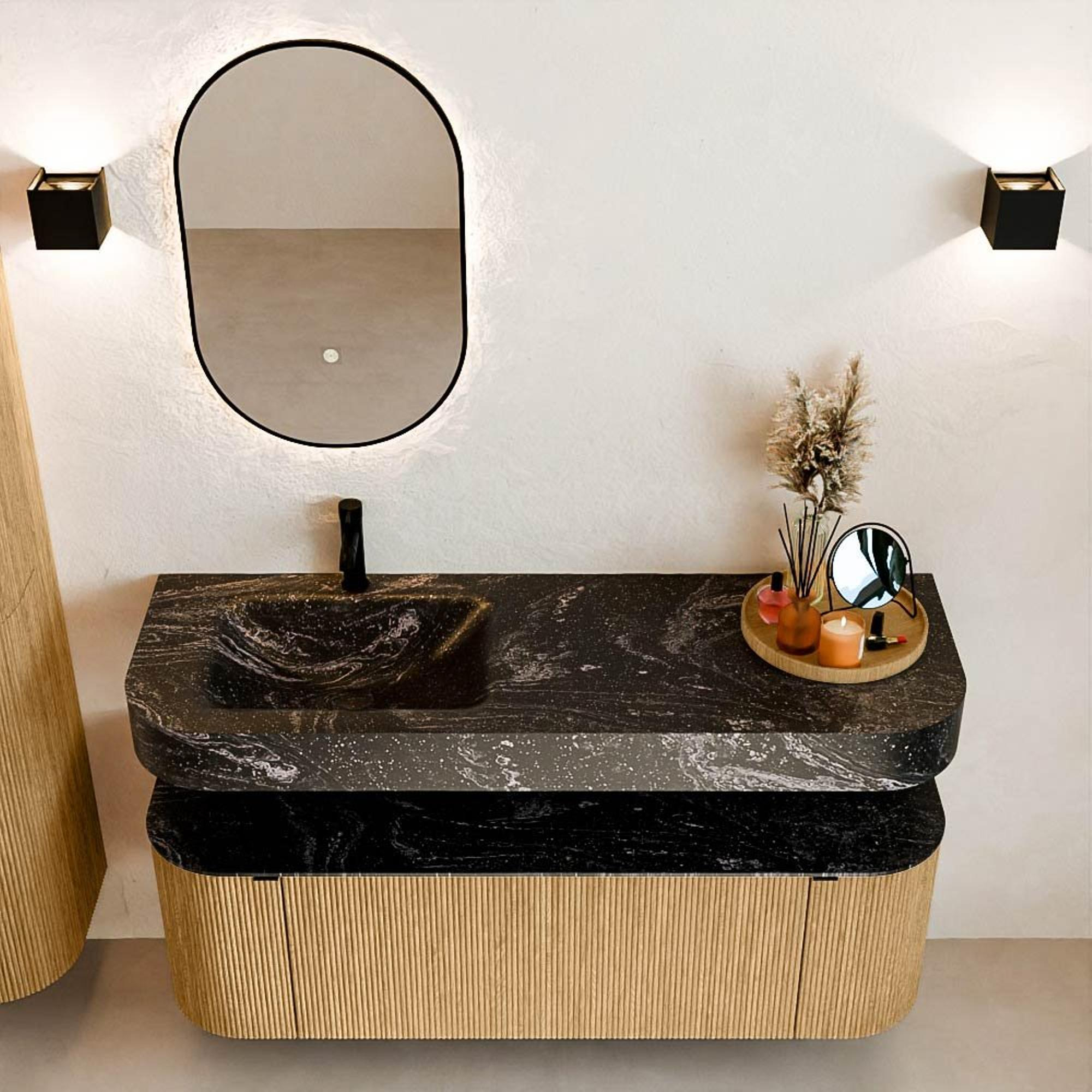 MONDIAZ THOR-DLUX 140cm meuble de salle de bains arrondi gauche + droite couleur Oak avec 1 tiroir et 2 portes. Vasque suspendue CLOUD gauche 1 trou de robinet couleur Lava.