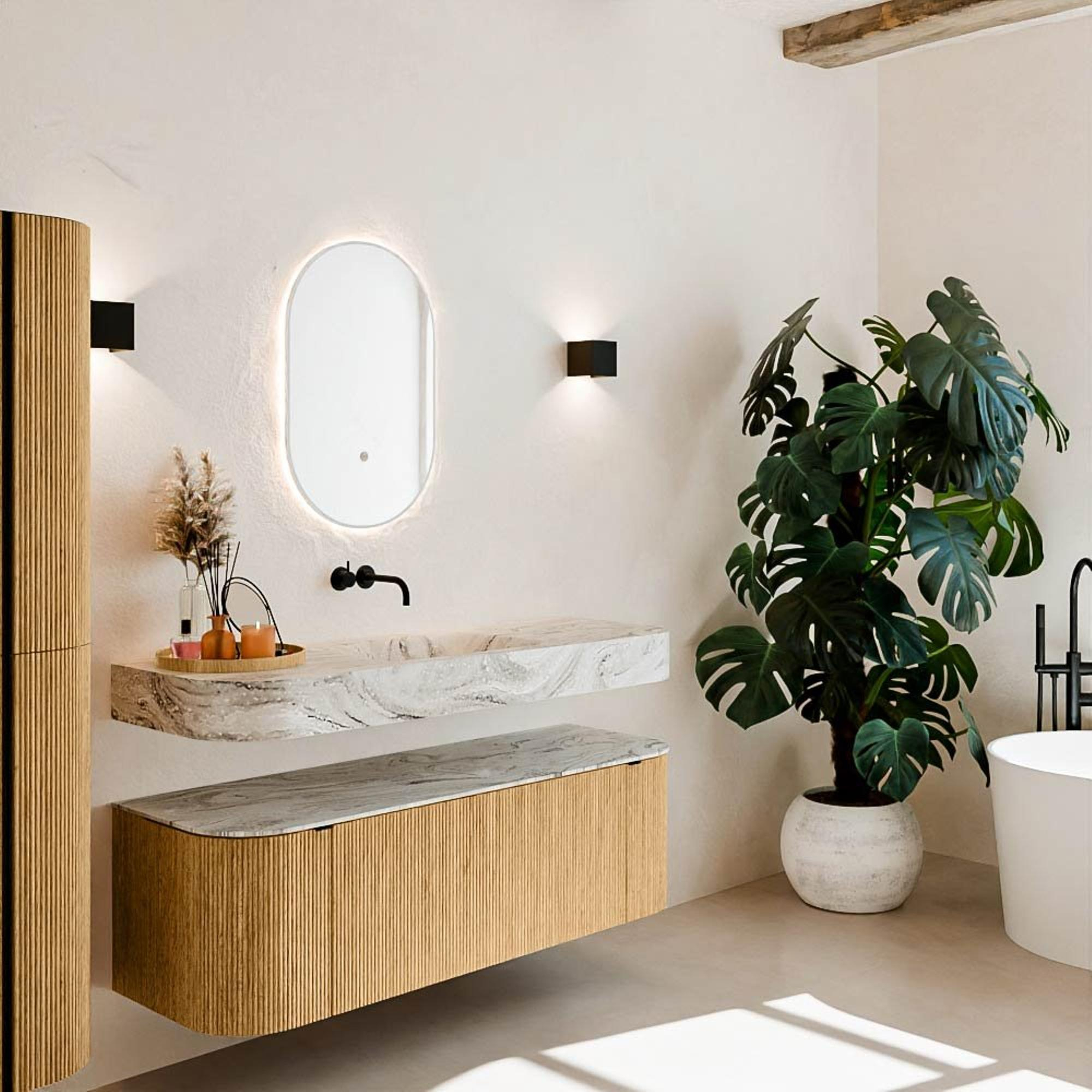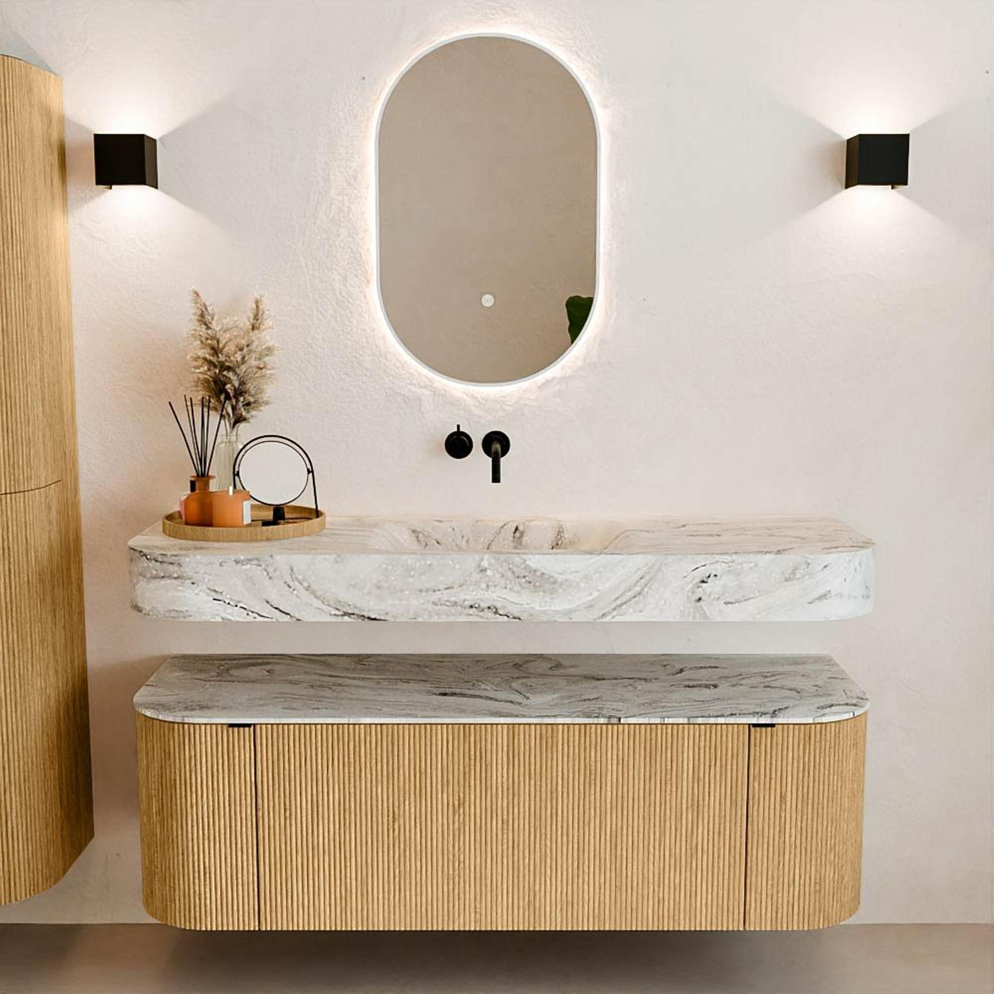 MONDIAZ THOR-DLUX 140cm meuble de salle de bains arrondi gauche + droite couleur Oak avec 1 tiroir et 2 portes. Vasque suspendue CLOUD Centre sans trou de robinet couleur Glace.