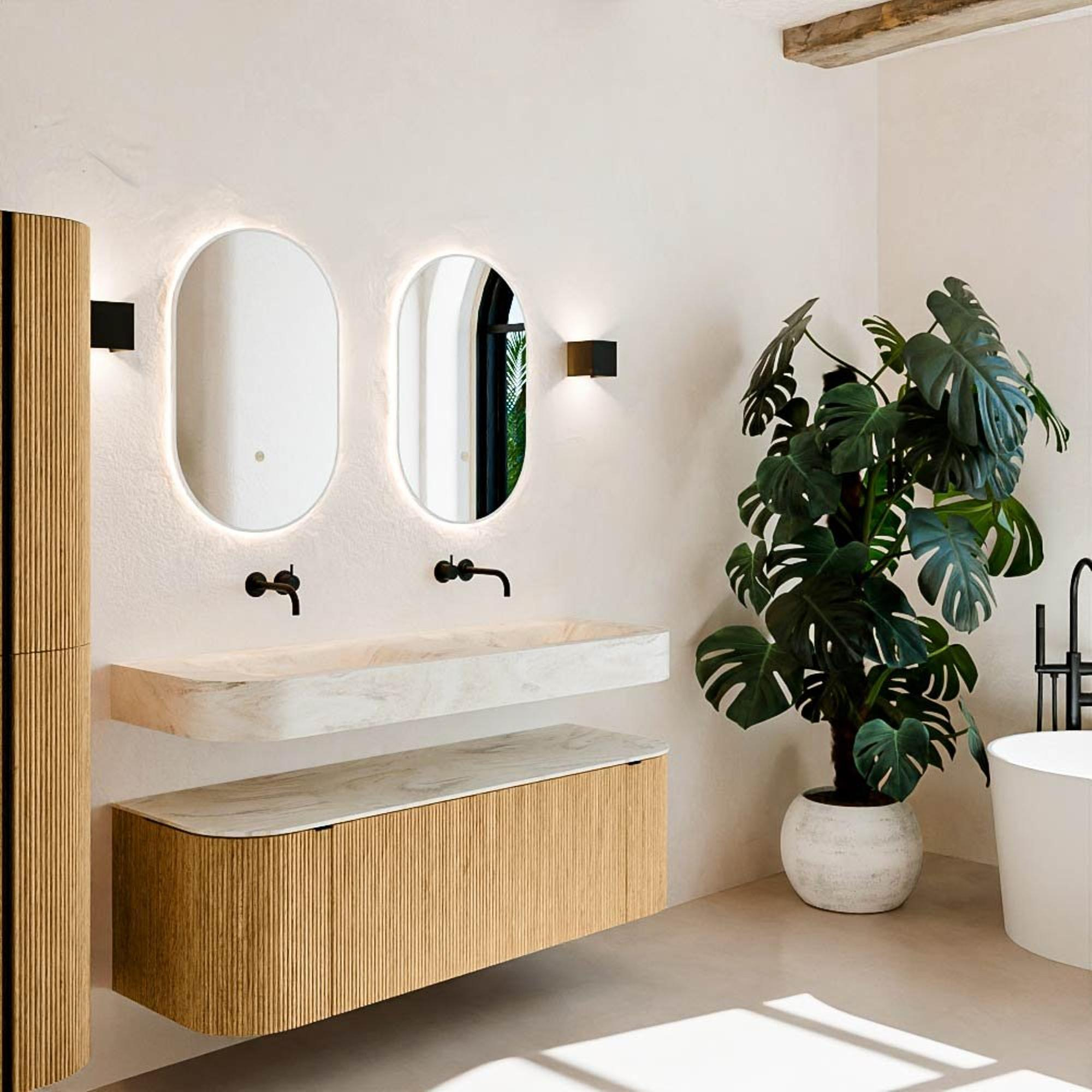 MONDIAZ THOR-DLUX 140cm meuble de salle de bains arrondi gauche + droite couleur Oak avec 1 tiroir et 2 portes. Vasque suspendue CLOUD Double sans trou de robinet couleur Ostra.