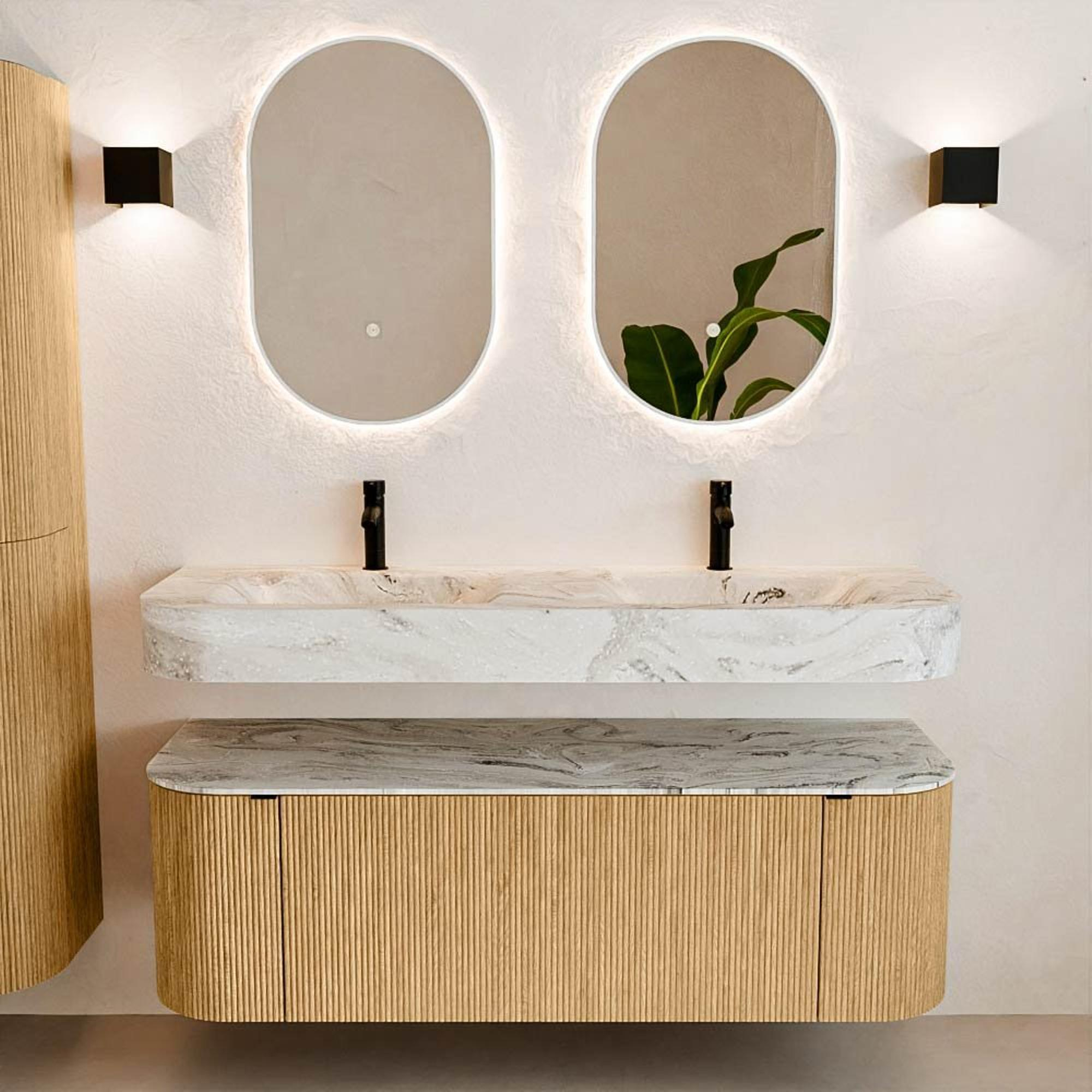 Matériaux naturels dans des tons chauds. Les nervures verticales apportent rythme et texture au design, tandis que le chêne confère une apparence chaleureuse et artisanale. Choisissez parmi 5 teintes de bois OAK, WALNUT, DUSK, SHADOW et RUBY, des couleurs de bois soigneusement sélectionnées pour enrichir les salles de bains modernes et classiques.
