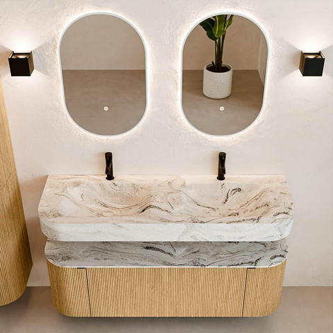 MONDIAZ THOR-DLUX 140cm meuble de salle de bains arrondi gauche + droite couleur Oak avec 1 tiroir et 2 portes. Vasque suspendue CLOUD Double 2 trous de robinet couleur Glace.