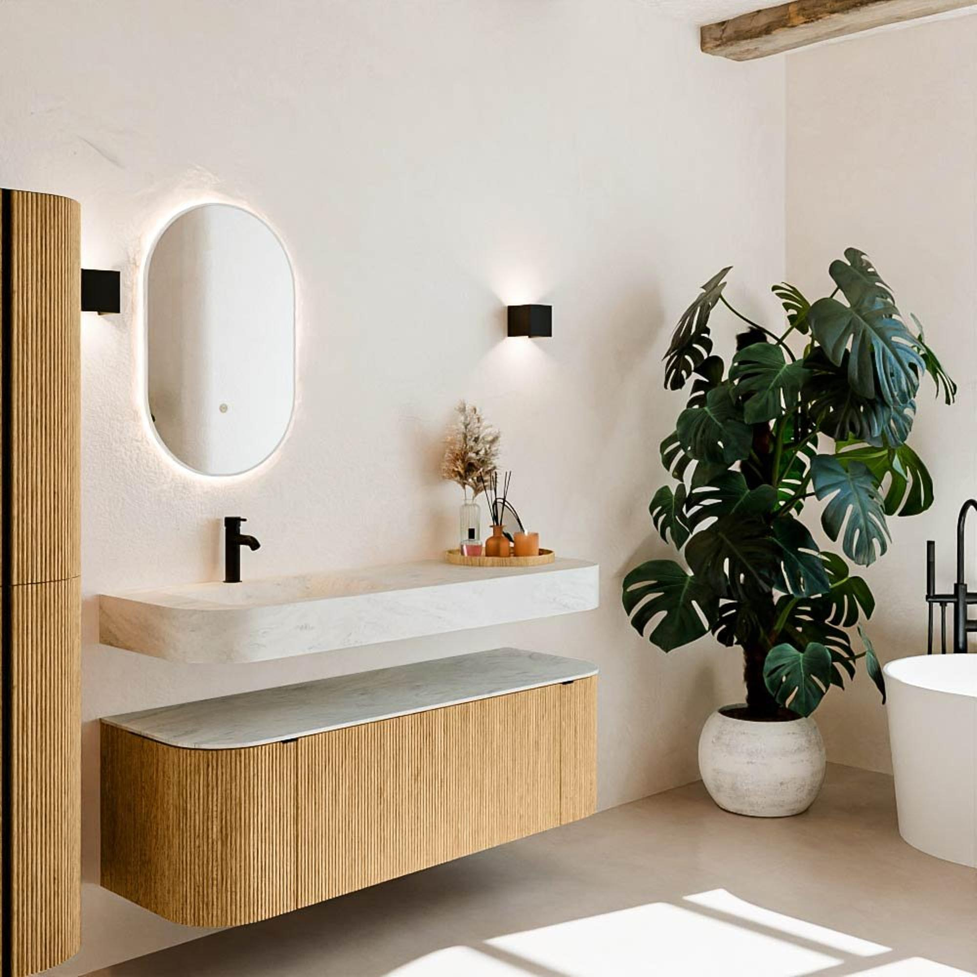 Matériaux naturels aux teintes chaudes. Les nervures verticales apportent rythme et texture au design, tandis que le chêne confère une apparence chaleureuse et artisanale. Choisissez parmi 5 teintes de bois OAK, WALNUT, DUSK, SHADOW et RUBY, des couleurs de bois soigneusement sélectionnées pour enrichir les salles de bains modernes et classiques.