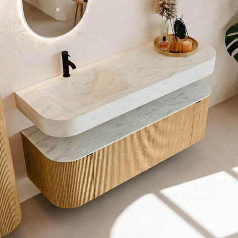 Au-dessus du meuble flotte une vasque suspendue assortie aux coins arrondis – parfaitement adaptée à la forme du meuble. La vasque est réalisée en Solid Surface et suit subtilement les lignes du meuble inférieur, créant ainsi un ensemble harmonieux. Le plan de travail en Solid Surface constitue une base solide et facile d'entretien, complétant la combinaison.