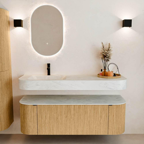 MONDIAZ THOR-DLUX Meuble de salle de bains 140cm arrondi gauche + droite couleur Oak avec 1 tiroir et 2 portes. Vasque suspendue CLOUD Gauche 1 trou de robinet couleur Opalo.
