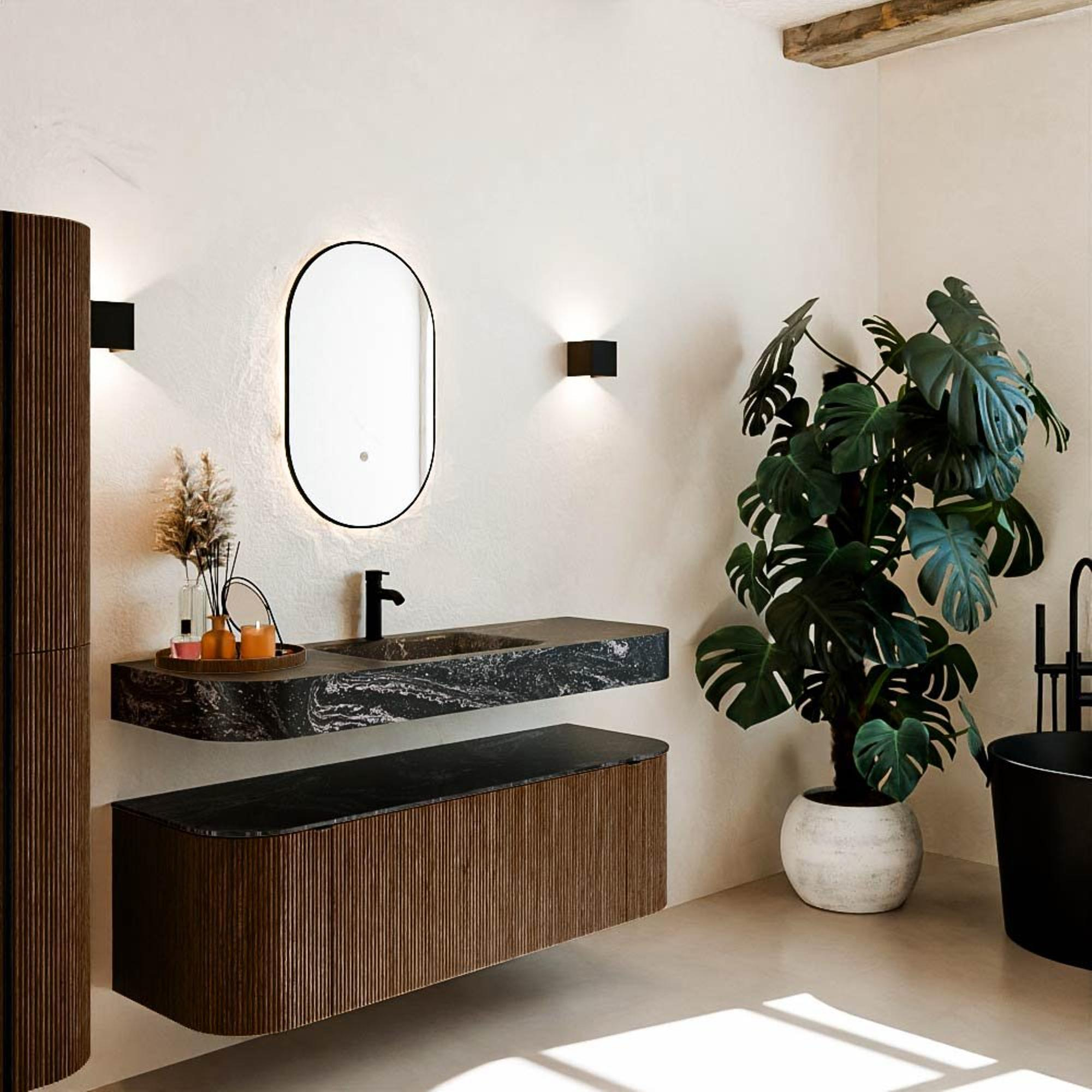 Matériaux naturels dans des tons chauds. Les nervures verticales apportent rythme et texture au design, tandis que le chêne confère une apparence chaleureuse et artisanale. Choisissez parmi 5 teintes de bois OAK, WALNUT, DUSK, SHADOW et RUBY, des couleurs de bois soigneusement sélectionnées pour enrichir les salles de bains modernes et classiques.