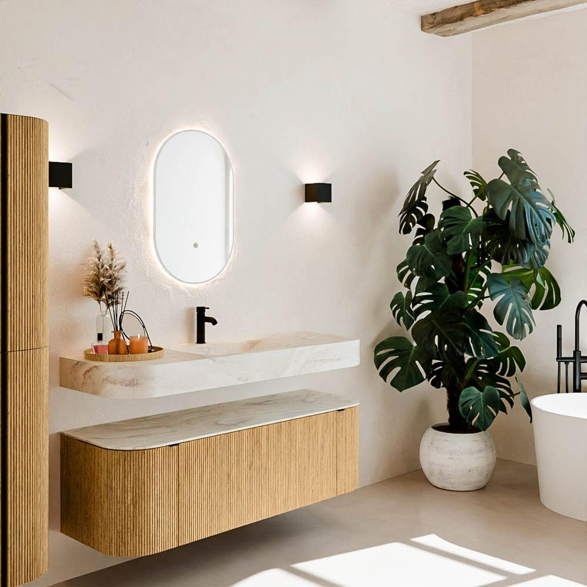 Matériaux naturels dans des tons chauds. Les nervures verticales apportent rythme et texture au design, tandis que le chêne confère une apparence chaleureuse et artisanale. Choisissez parmi 5 teintes de bois OAK, WALNUT, DUSK, SHADOW et RUBY, des couleurs de bois soigneusement sélectionnées pour enrichir les salles de bains modernes et classiques.