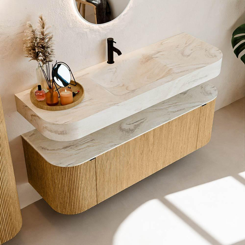 Au-dessus du meuble flotte une vasque suspendue assortie aux coins arrondis – parfaitement adaptée à la forme du meuble. La vasque est réalisée en Solid Surface et suit subtilement les lignes du meuble inférieur, créant ainsi un ensemble harmonieux. Le plan de travail en Solid Surface forme une base solide et facile d'entretien et complète la combinaison.