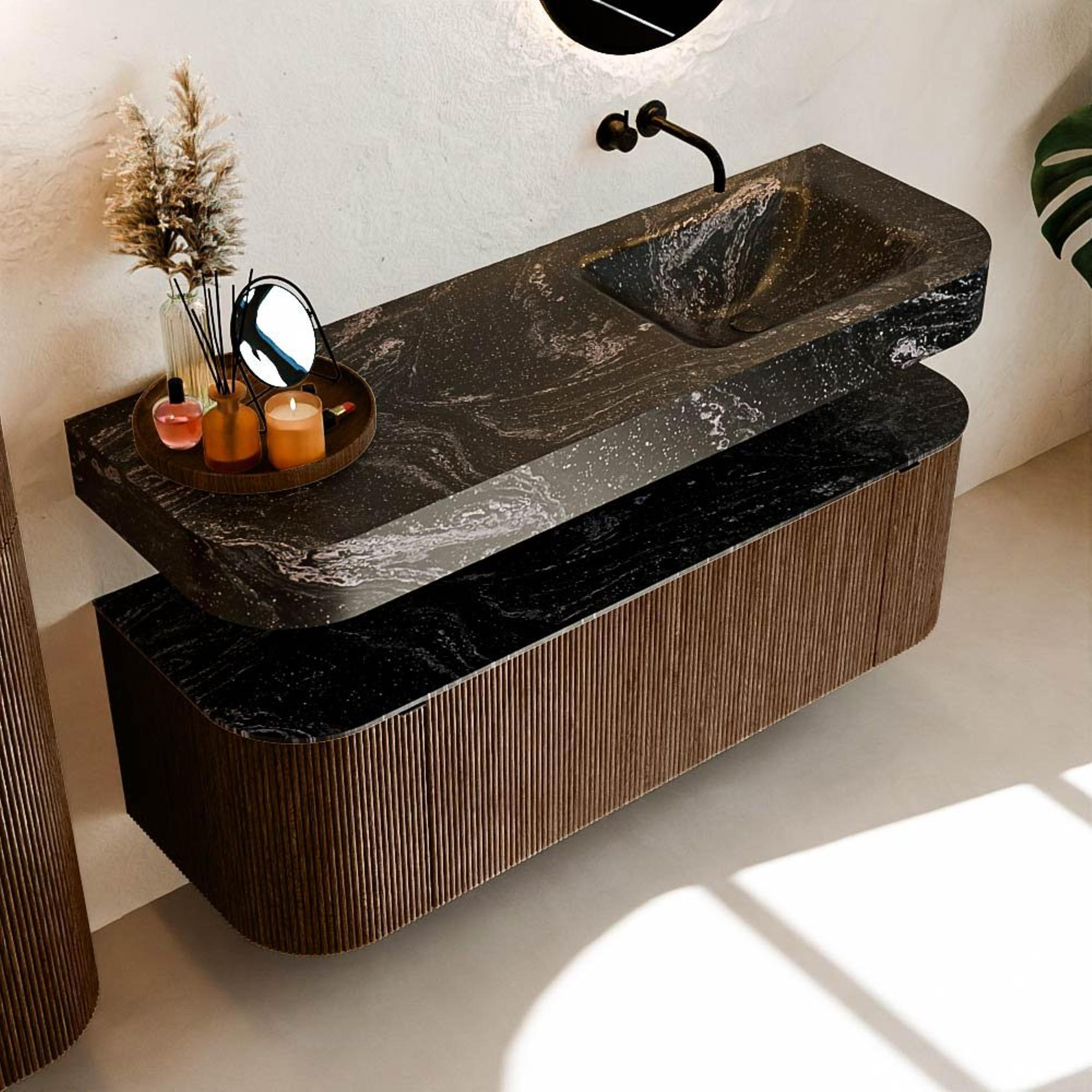 MONDIAZ THOR-DLUX 140cm meuble de salle de bains arrondi gauche + droite couleur Walnut avec 1 tiroir et 2 portes. Vasque suspendue CLOUD Droite sans trou de robinet couleur Lava.
