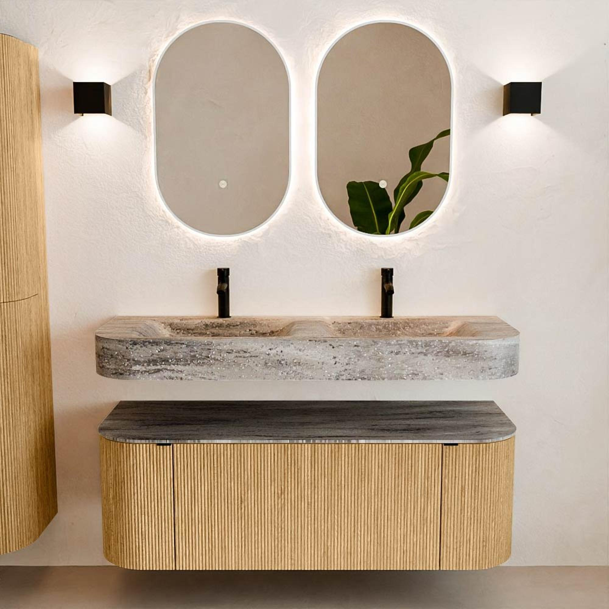 MONDIAZ THOR-DLUX 130cm meuble de salle de bains arrondi gauche + droite couleur Oak avec 1 tiroir et 2 portes. Vasque suspendue CLOUD Double 2 trous de robinet couleur Oza.