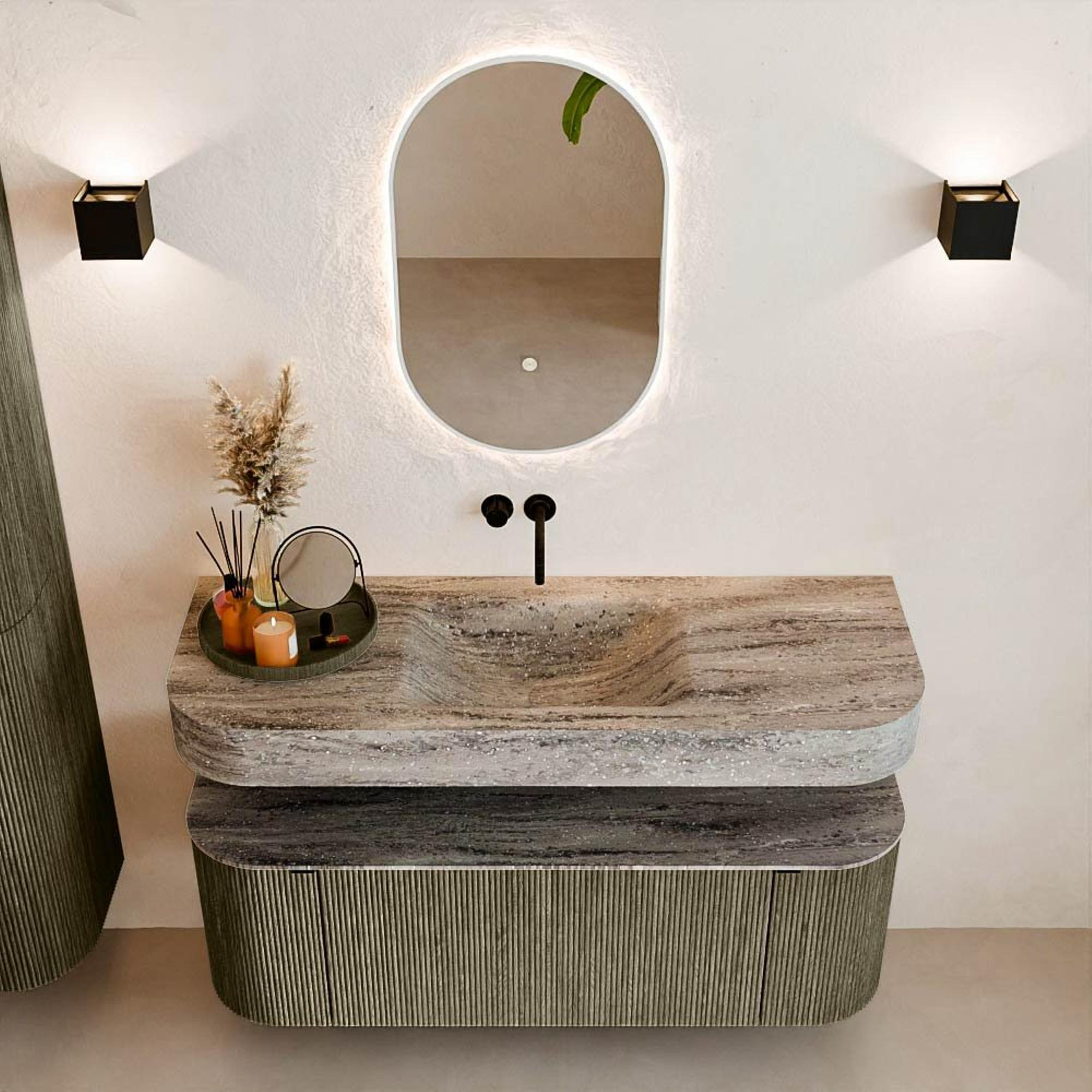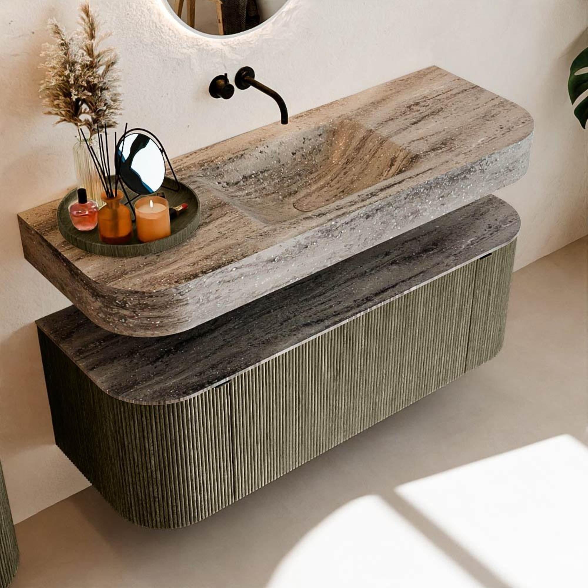 MONDIAZ THOR-DLUX 130cm meuble de salle de bains arrondi gauche + droite couleur Shadow avec 1 tiroir et 2 portes. Vasque suspendue CLOUD Milieu sans trou de robinet couleur Oza.